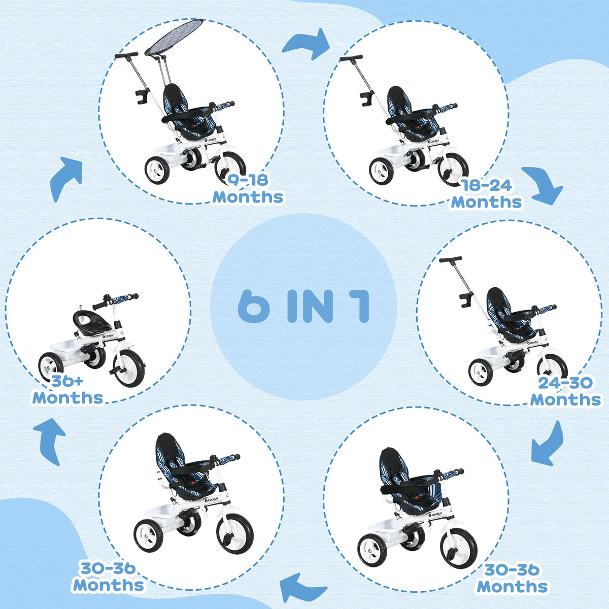 HOMCOM 6 in 1 Tricycle for Kids with 5-point harness straps, Removable Canopy, Blue - Blue