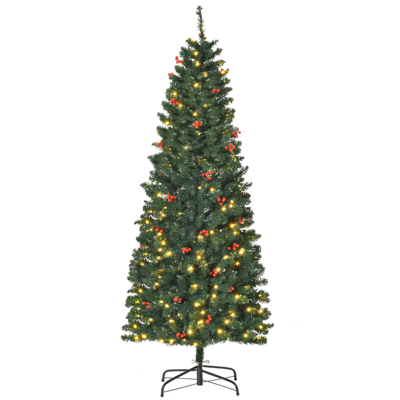 HOMCOM 6FT Prelit Artificial Pencil Christmas Tree with Warm White LED Light, Red Berry, Holiday Home Xmas Decoration, Green - Emerald green