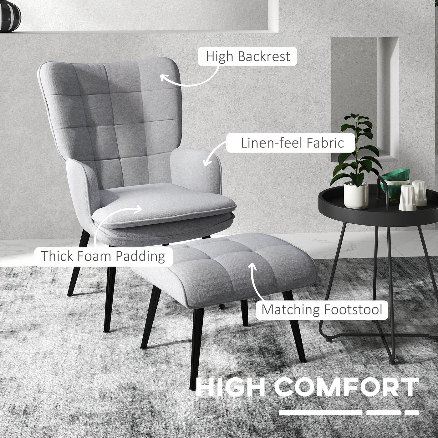 Double the comfort - double the style. This HOMCOM set comes with a large armchair and footstool, so you can relax your body and rest up your legs, all at the same time. In a relaxed and modern shape, the armchair gives you plenty of room to lay back, with a padded seat for comfort and a high back for support. Linen-feel upholstery adds to the softness; paired with the painted steel legs for a luxe look. Complete with steel legs for strong support.