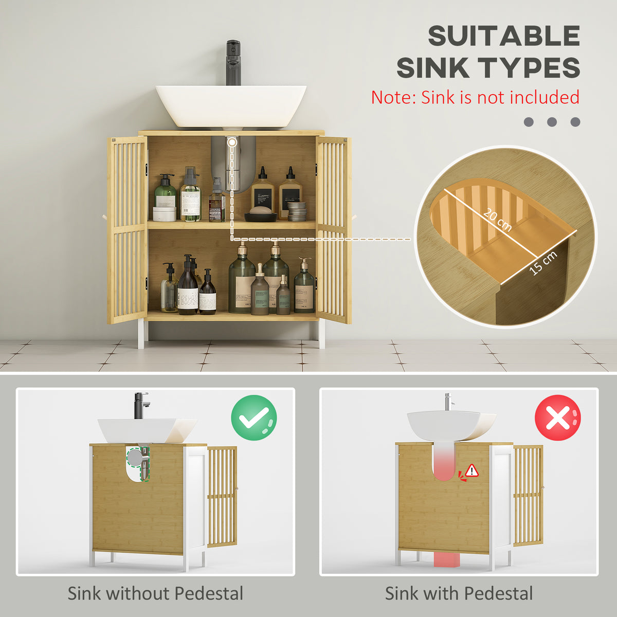 Retro charm for your bathroom, merged with adjustable storage. This HOMCOM under sink unit features a 'U' slot, which fits snugly around sink pipes - brings in storage without taking up a lot of unnecessary space. Inside, it features a three-position adjustable shelf, so you can set it to the position you want. Made from a bamboo blend, this sink storage cabinet is a durable piece, suitable for everyday use.