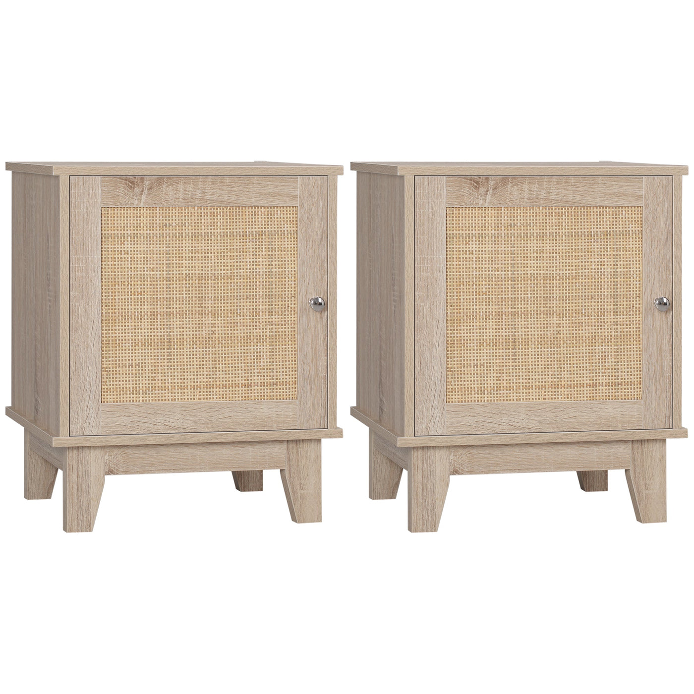 HOMCOM Bedside Table, Bedside Cabinet with Storage Cupboard, Side End Table with Rattan Element for Living Room, Bedroom, Set of 2, Natural - Natural wood finish