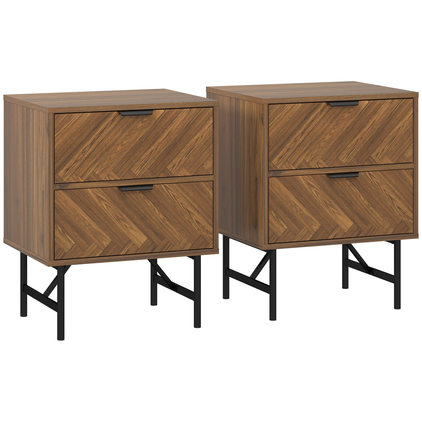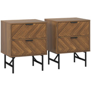 HOMCOM Bedside Table Set of 2 with 2 Drawers, Modern Side Tables with Herringbone Pattern and Metal Legs for Bedroom, Living Room, Walnut Brown - Walnut Brown