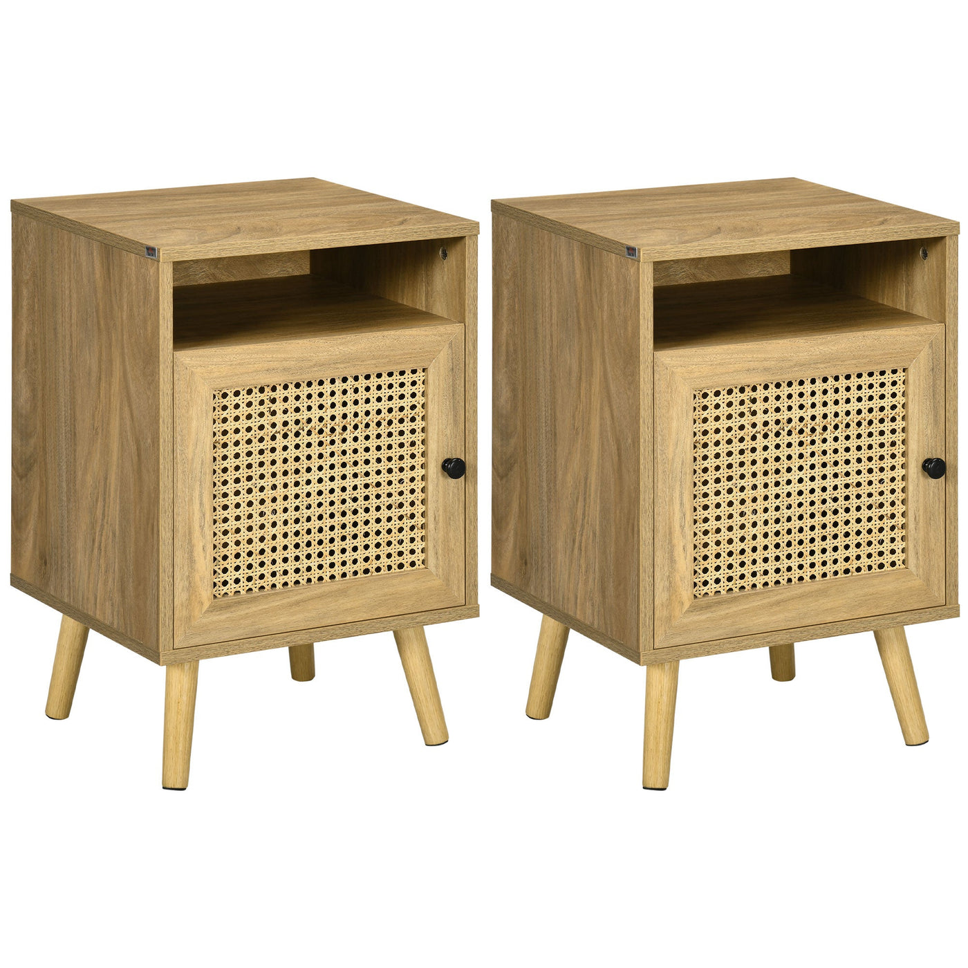 HOMCOM Bedside Table with Rattan Element, Side End Table with Shelf and Cupboard, 39cmx35cmx60cm, Set of 2, Natural - Natural wood finish