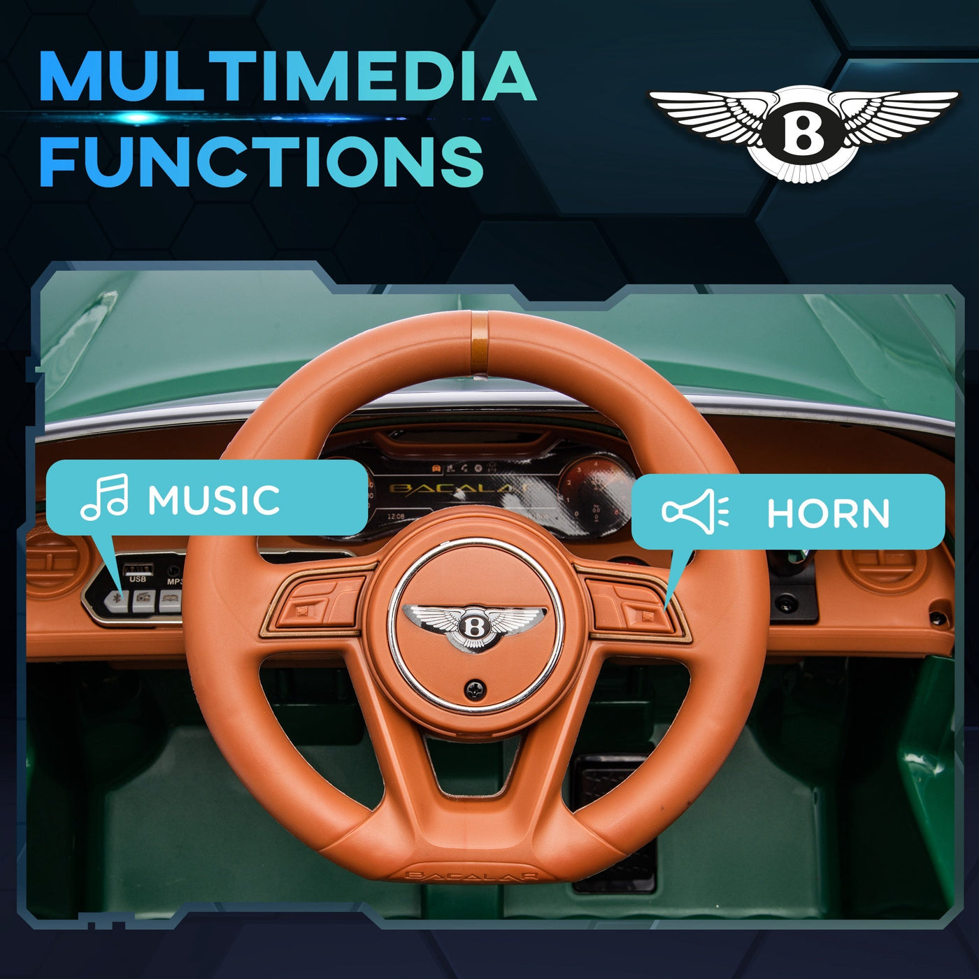 HOMCOM Bentley Bacalar Licensed 12V Kids Electric Car, with Remote Control, Horn, Lights, Music, Suspension Wheels, Green - Green