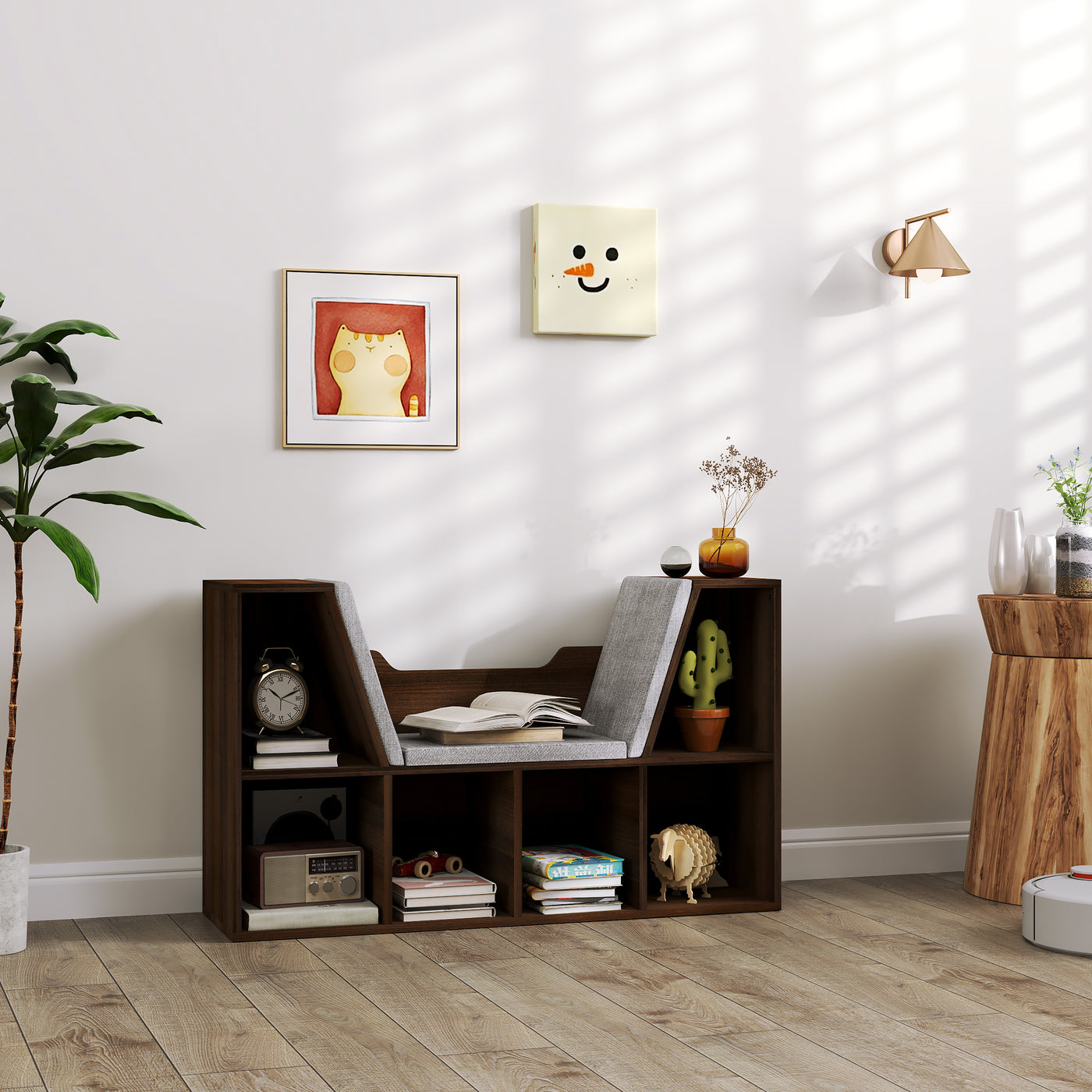 HOMCOM Bookcase Storage Shelf with Cushioned Reading Seat, Cube Bookshelf Organizer for Bedroom Living Room, Chestnut - Chestnut
