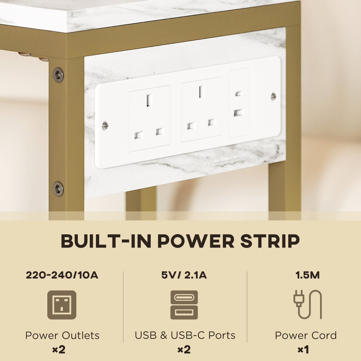 Discover the convenience of our HOMCOM side table, featuring two power outlets, two USB ports and a USB-C port. Its C-shaped elegance, adorned with faux marble panels and gold-tone steel, enhances any space. Enjoy the broad tabletop and a chic fabric storage bag below. A stylish and practical choice, whether used as a nightstand, end table, or sofa side table.