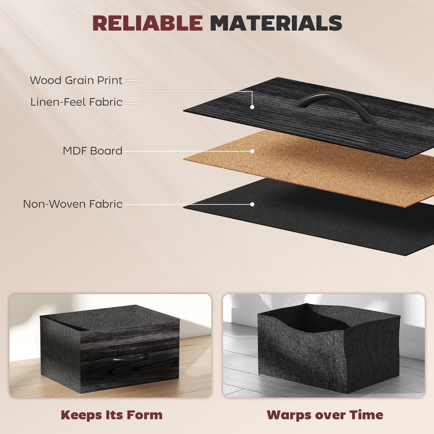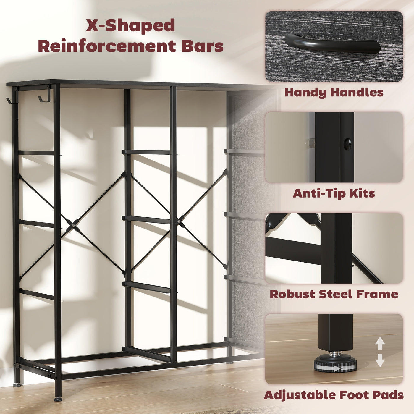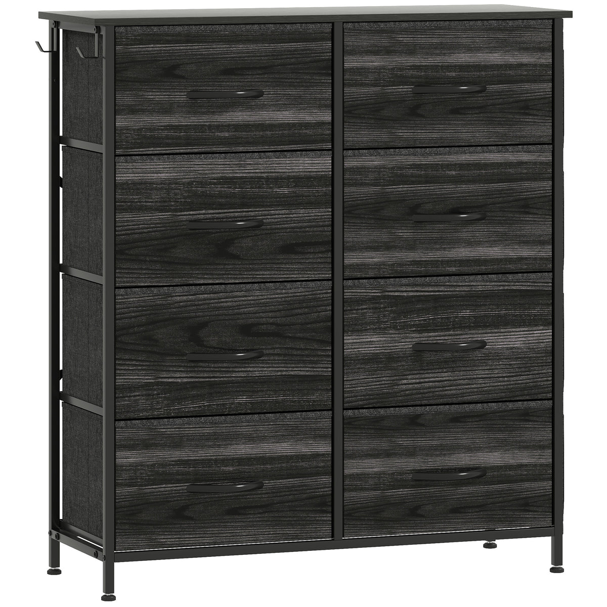 Easy, simple storage with this HOMCOM fabric chest of drawers. With eight same drawers, it's easy to sort everything from socks to pants. It also features four side pockets and two hooks to get smaller accessories altogether. A steel frame with X-bars keeps this bedroom dresser stable, finished with adjustable feet for balance - even on unsteady grounds.
