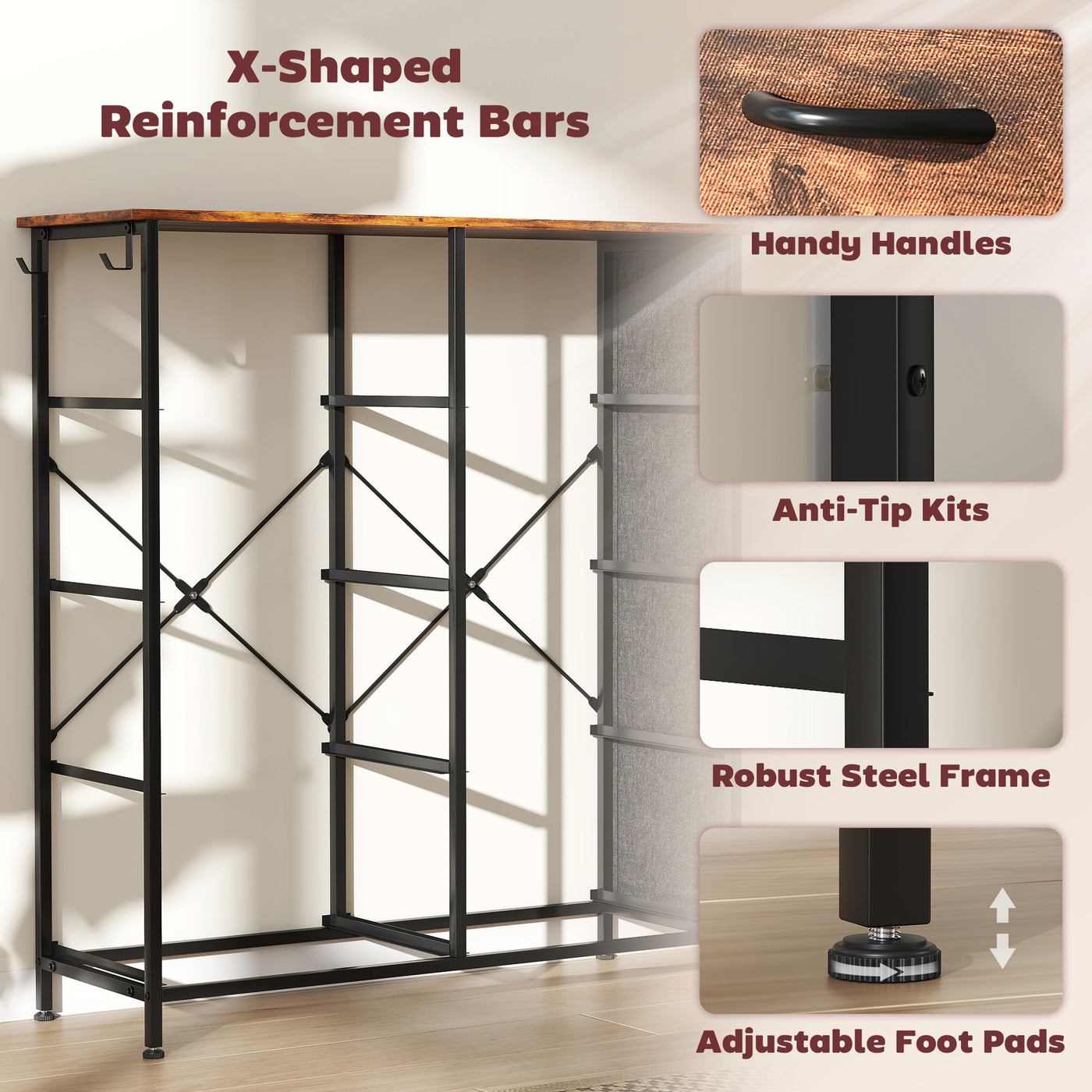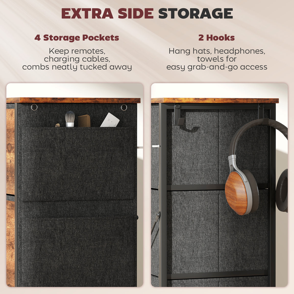 Easy, simple storage with this HOMCOM fabric chest of drawers. With eight same drawers, it's easy to sort everything from socks to pants. It also features four side pockets and two hooks to get smaller accessories altogether. A steel frame with X-bars keeps this bedroom dresser stable, finished with adjustable feet for balance - even on unsteady grounds.