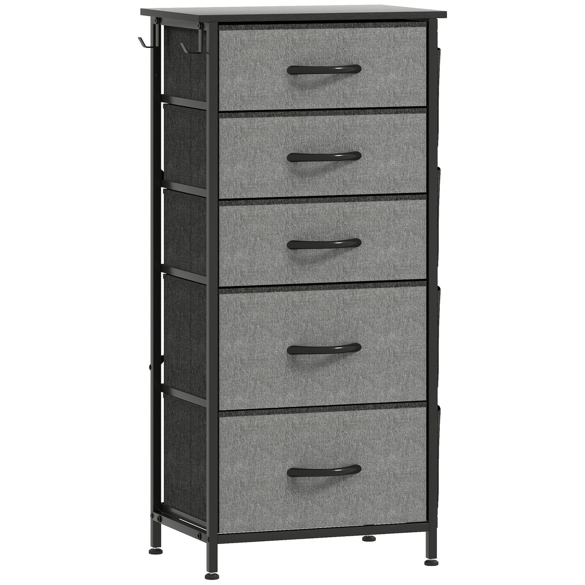 Easy, simple storage with this HOMCOM fabric chest of drawers. With three small and two large drawers, it's easy to sort everything from socks to pants. It also features four side pockets and two hooks to get smaller accessories altogether. A steel frame with X-bars keeps this bedroom dresser stable, finished with adjustable feet for balance - even on unsteady grounds.