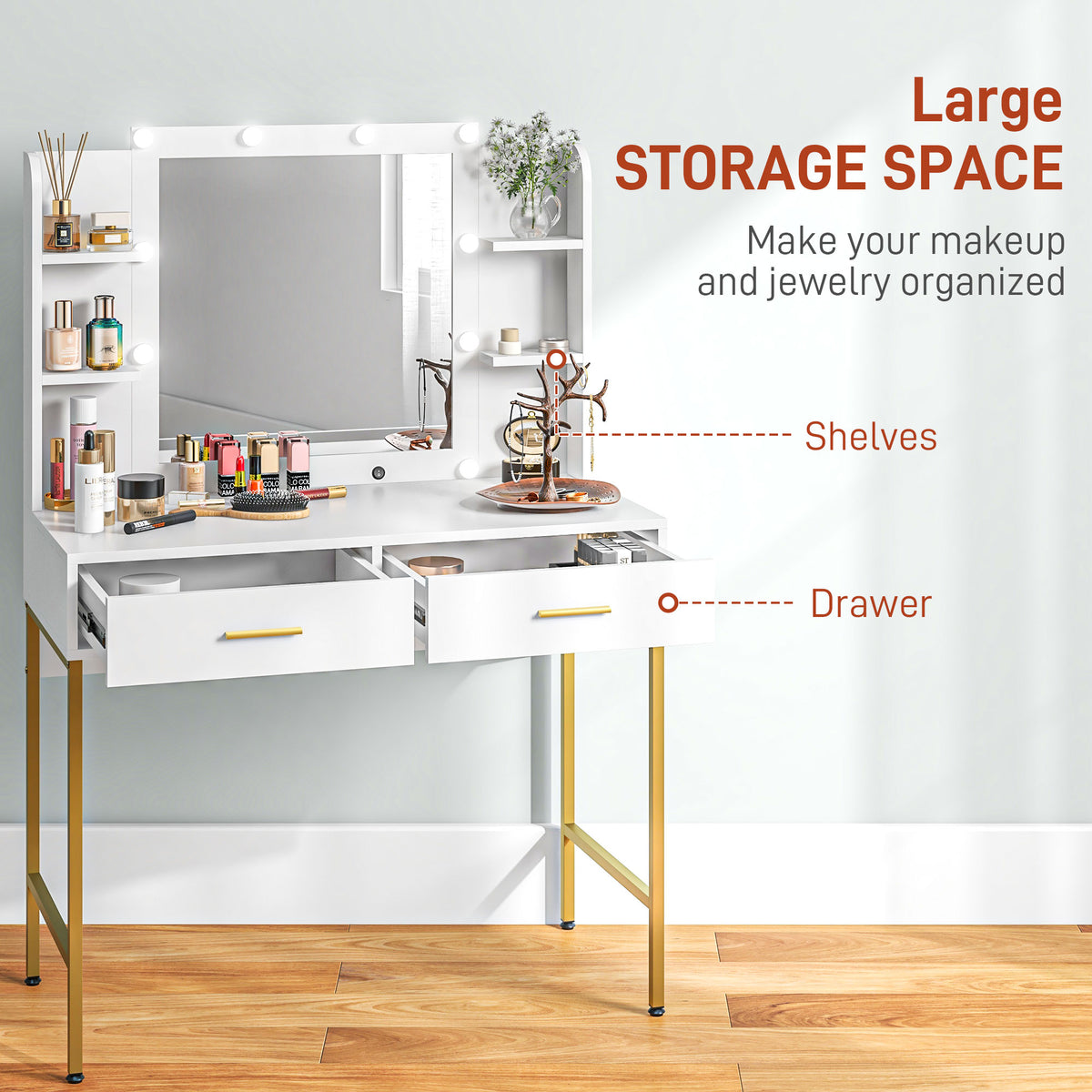 Make-up routines, at any time of day gravitate around this HOMCOM makeup desk set. Around the large mirror, there are 10 warm white Hollywood light bulbs. This vanity desk features a spacious tabletop, two smooth-sliding drawers and six upper shelves - plenty of room for keeping make-up and beauty products conveniently next to you as get ready.