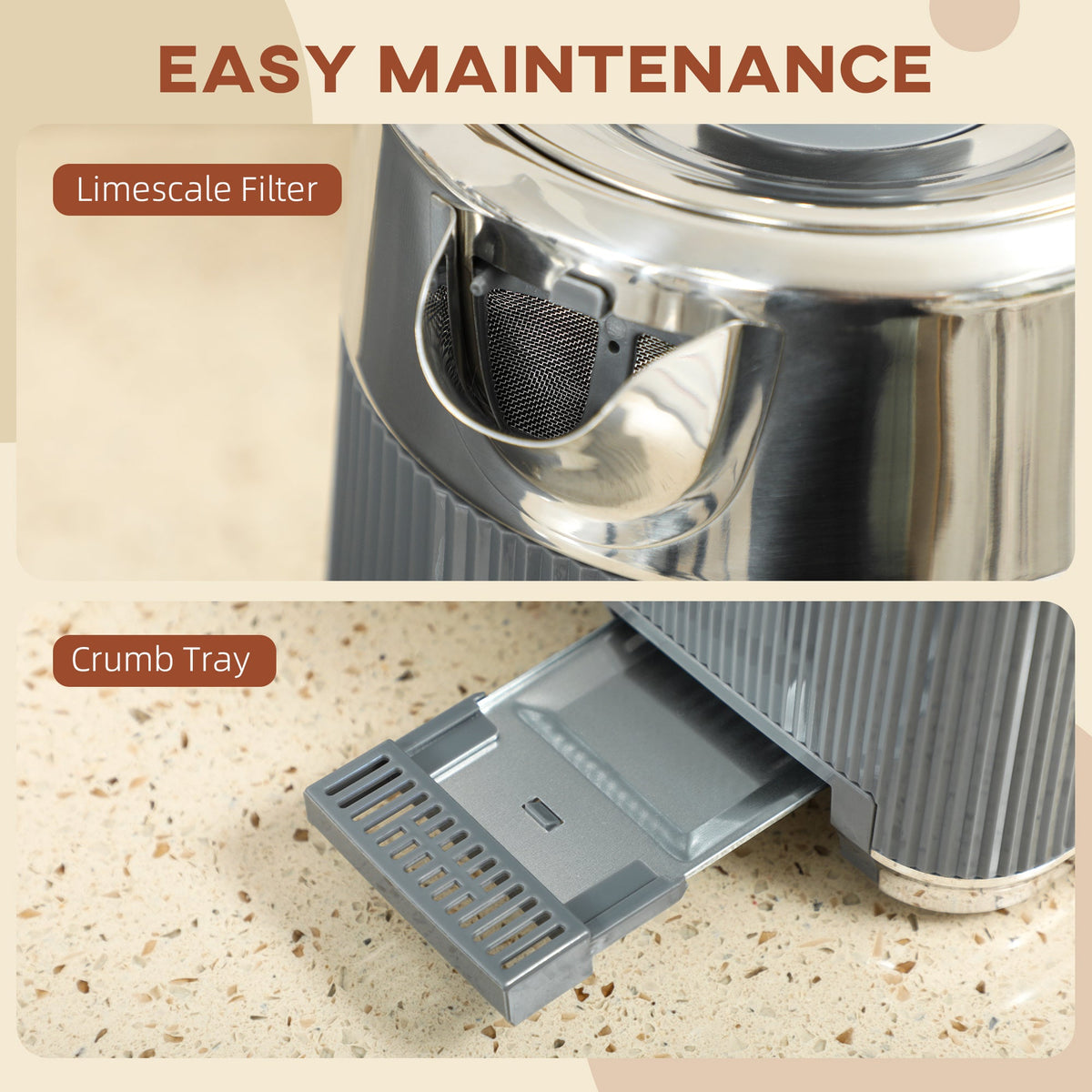 HOMCOM Electric Kettle and Toaster Set, 3000W 1.7L UK Strix Thermostat Rapid Boil Jug Kettle with Limescale Filter, Cool Touch Body, 4 Slice Toaster with 7 Browning Controls, Crumb Tray, Grey - Grey