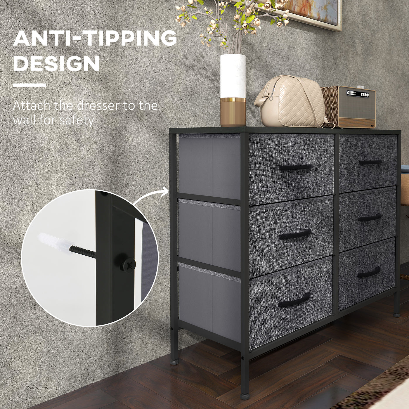 Home storage with this HOMCOM fabric chest of drawers. The six fabric drawers offer room for lots of things - keep t-shirts, tops, bottoms and more organised. The wood-effect top offers more room: a great place to display your favourite photos. The steel frame makes a strong core, with adjustable feet for balance. Comes with anti-tipping straps for safety. Use all over the home and office.