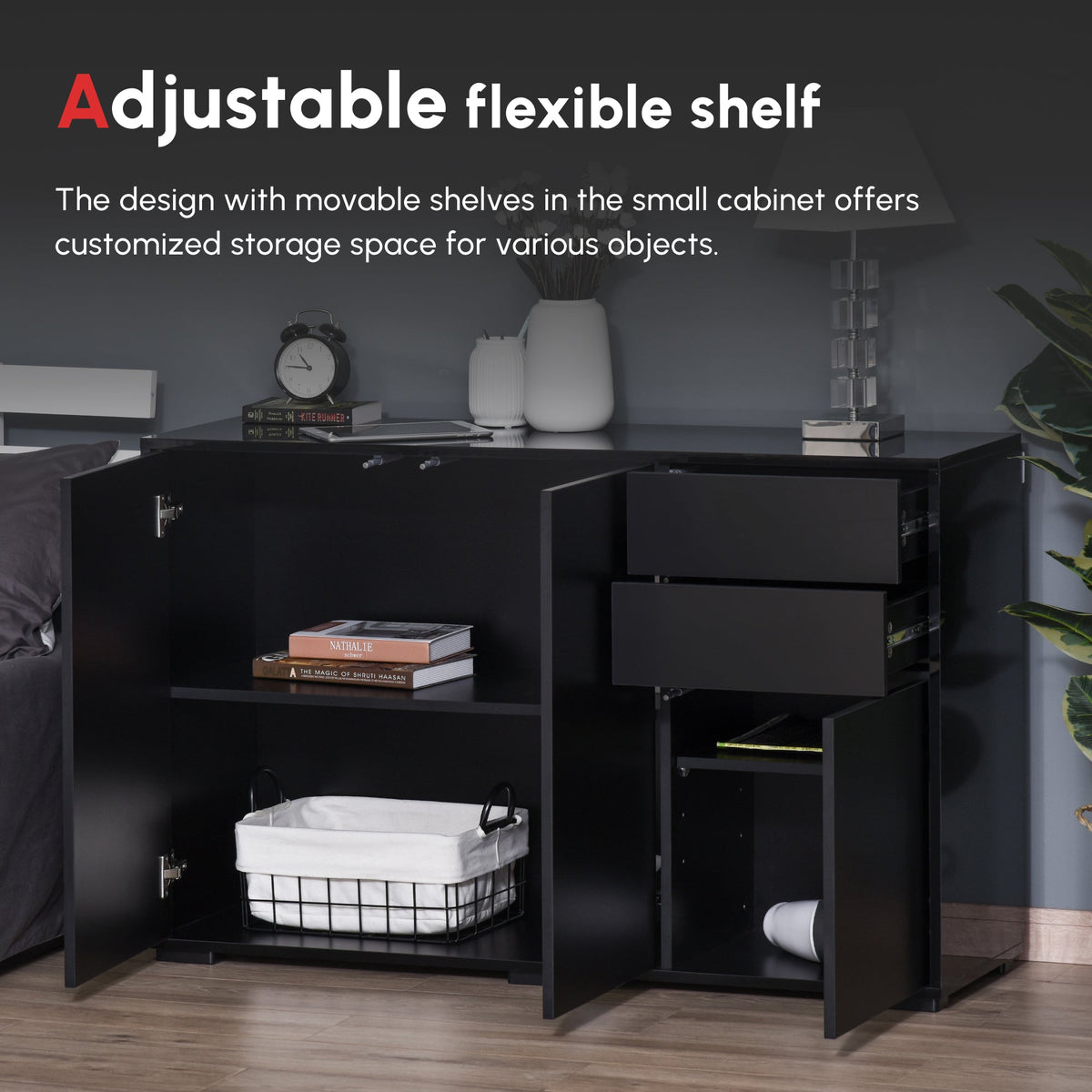 This small sideboard from HOMCOM is a durable and stylish addition to every home, keeping your space clean and tidy with ease. It's made from particle board for a durable structure, with anti-tipping straps on the back for safety. With the push-click design, drawers and cabinet doors are quick and effortless to open and close. The elevated base allows air to flow through for freshness. An effortless way to bring in sleek style into your living space with our HOMCOM storage cupboard.