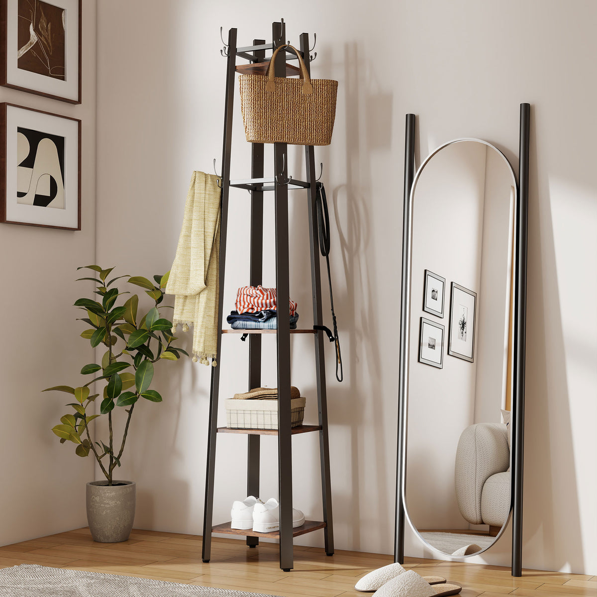 Struggling to keep coats and bags organised in limited space? The HOMCOM coat rack brings order and style to your entryway. Its tower-like frame fits effortlessly into corners or narrow hallways, while eight triple-prong hooks and four shelves keep coats, bags and hats neatly organised. The HOMCOM coat stand with matte black metal and wood-effect shelves adds an industrial charm that blends beautifully with any interiors—making your home both functional and stylish.