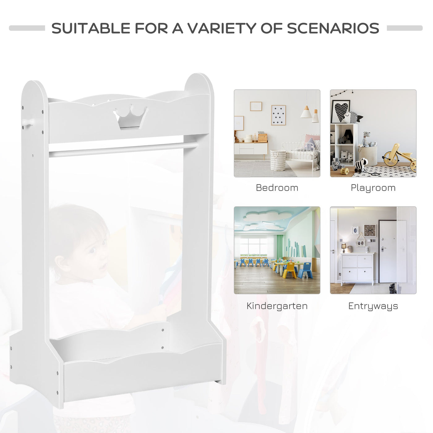 Transform your child's room into a magical space with the HOMCOM clothes rack, designed for little ones who adore dressing up. This versatile piece features a clothes rail, side shelves, and top and side hooks, offering ample space for organizing outfits and accessories. Perfectly sized for children aged 3-8, it combines functionality with charm, thanks to its delightful cut-out crown detail. Ideal for parents seeking to enhance room decor while teaching organizational skills, this rack adds a regal touch to any child's sanctuary.
