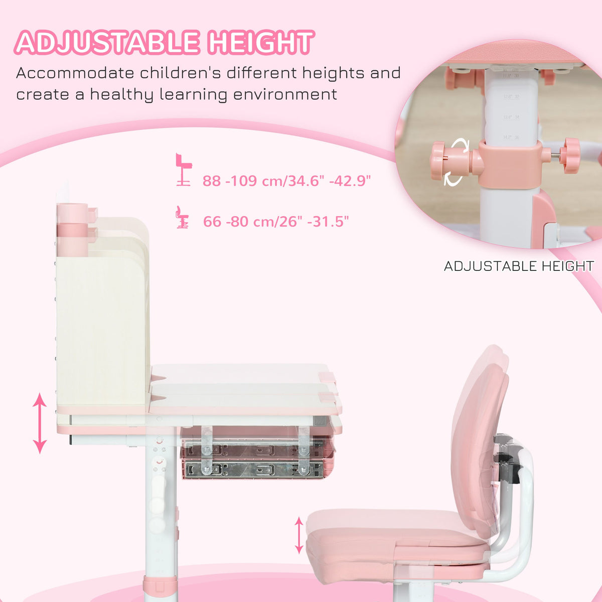 Learning is crucial for child development; they'll do that and more with this HOMCOM desk and chair set. Their own space to play, learn, develop and become independent, getting the most out of their early years. For ages 3-12 years, it's useful from nursery right up until the first year of high school. Sitting on a comfortable and cushioned seat, its curved backrest and adjustable tabletop promote good posture. Finished with a drawer, shelf and pen holder to keep everything neat and organised.