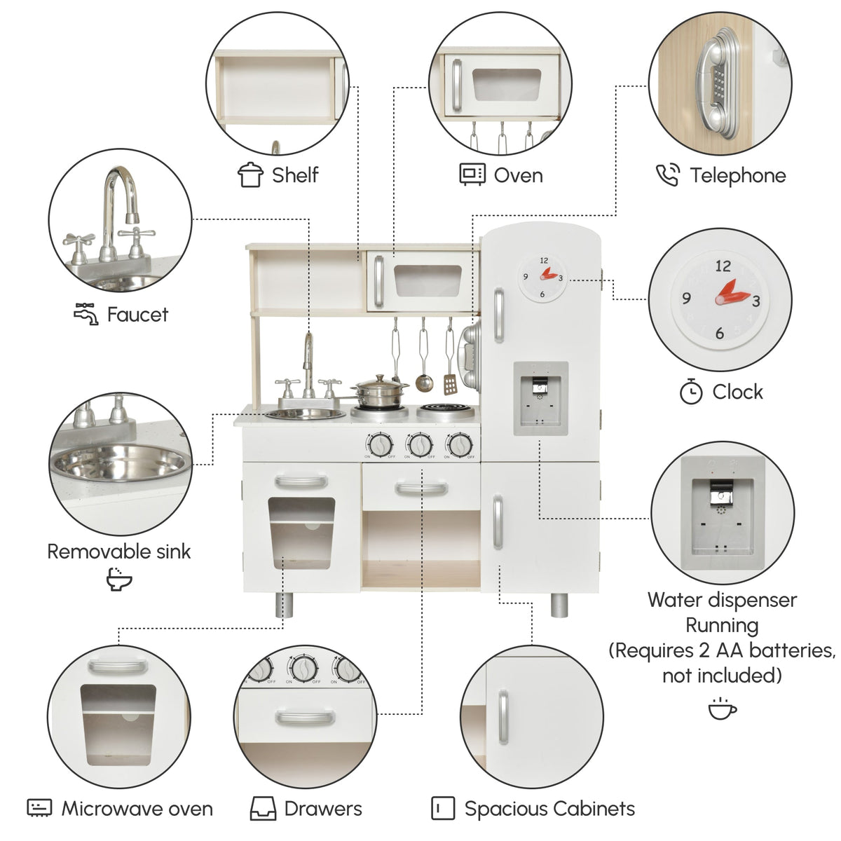 HOMCOM Kids Wooden Pretend Play Toy Kitchen Cooking Set Role Play Phone for Boys Girls White - White