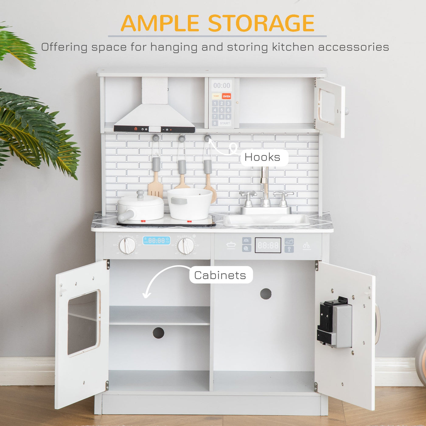 HOMCOM Kids Wooden Toy Kitchen Pretend Play Cooking Playset w/ Sound & Light Effect, Battery Operated Cooktop, Ice Machine, Marble Pattern Countertop, for 3-6 Years Old - Grey
