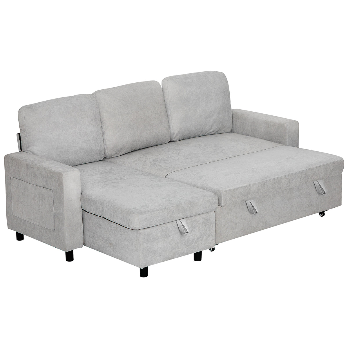 This HOMCOM three seater sofa bed is here from day to night. Convert from a loveseat into a double sofa bed with a simple pull. Plus, utilise the small storage under the chaise, suitable for blankets and more. Whether for comfortable everyday lounging or accommodating overnight guests, this L shaped sofa bed does it all.