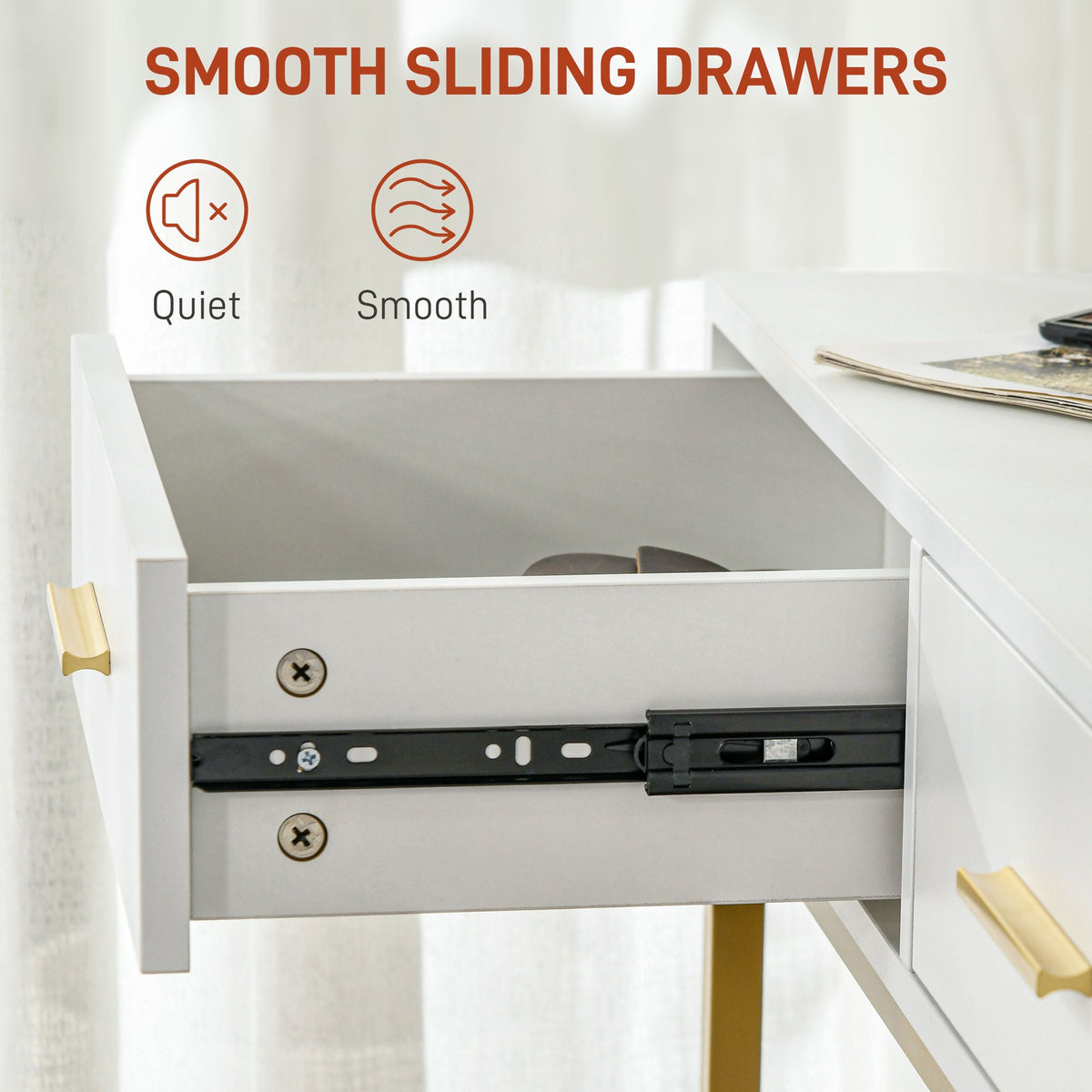 - Spacious tabletop, two drawers, six shelves: lots of storage room