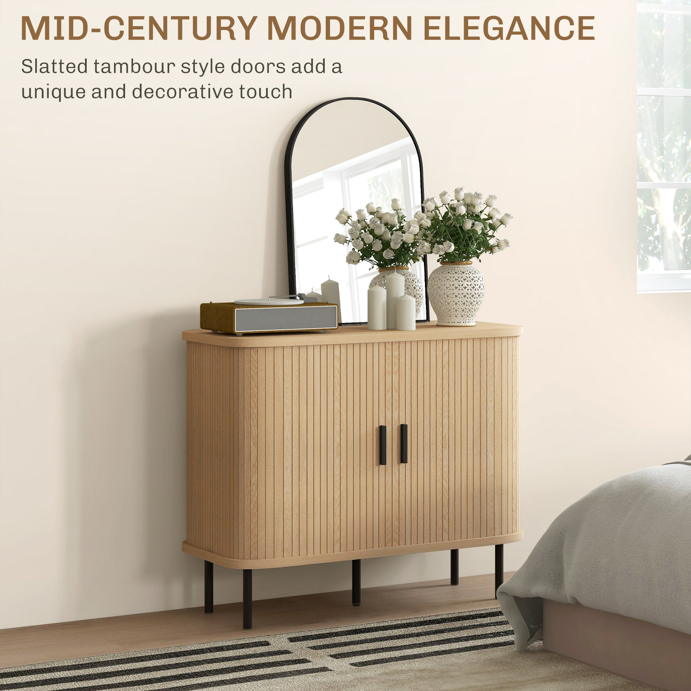 HOMCOM Mid-Century Modern Sideboard Storage Cabinet with Slatted Tambour Sliding Doors, Kitchen Cabinet with Steel Legs, Oak Tone - Oak Tone