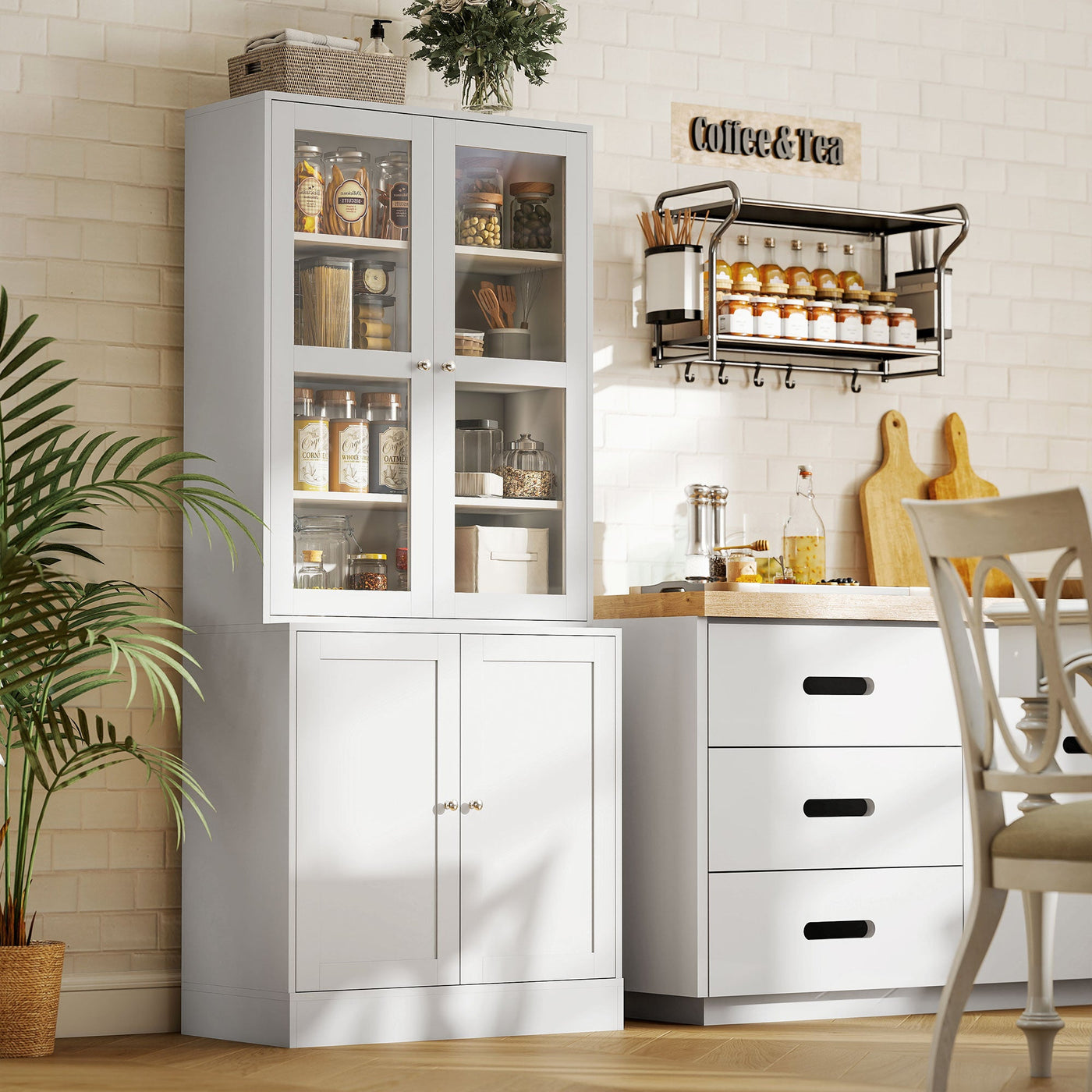 HOMCOM Modern Bookcase with Glass Doors, Display Storage Cabinet with Adjustable Shelves for Living Room, Study, Home Office, Kitchen Cupboard with Small Open Counter, White - White