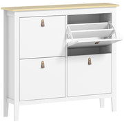 Effortlessly beautiful home storage comes in the form of this HOMCOM slim shoe storage cabinet. A modern boxy shape, in a touch of colour, this narrow shoe cabinet brings in a gentle touch of character into your space. With four flip drawers, it can hold 20x shoe pairs, maximum size uk mens 10.5. All drawers have a two-level adjustable shelf, allowing you to fit in all kinds of footwear. Comes with an anti-tipping kit to securely fix to a wall.