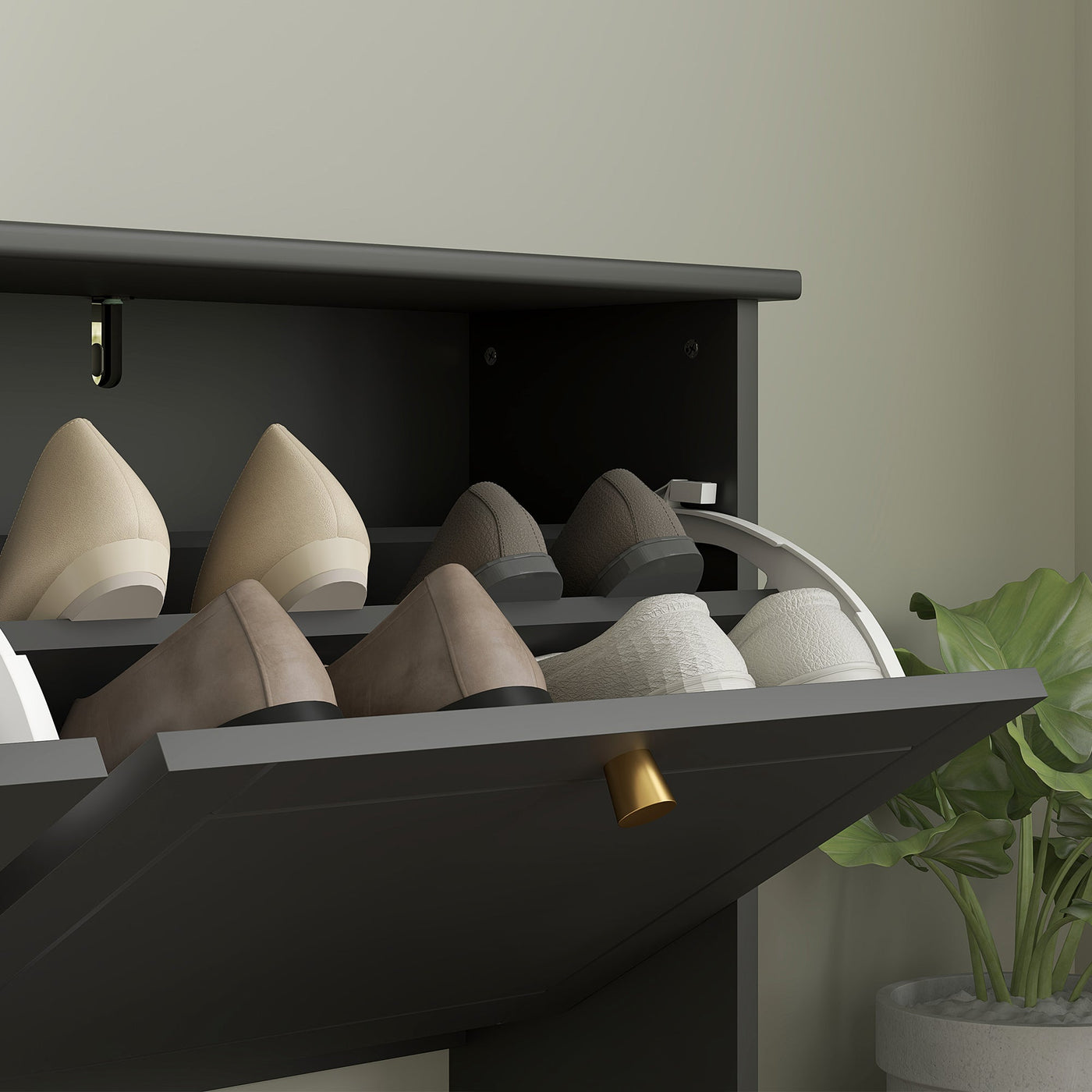 Step into style and organization with the slim shoe storage cabinet from HOMCOM. Its sleek finish, carved lines and chic golden handles add a modern twist to any entryway. This hidden narrow shoe storage features four flip drawers that neatly store up to 16 pairs of shoes, with adjustable shelves for added convenience. Suitable for tight spaces, this hallway cabinet combines elegance with functionality.