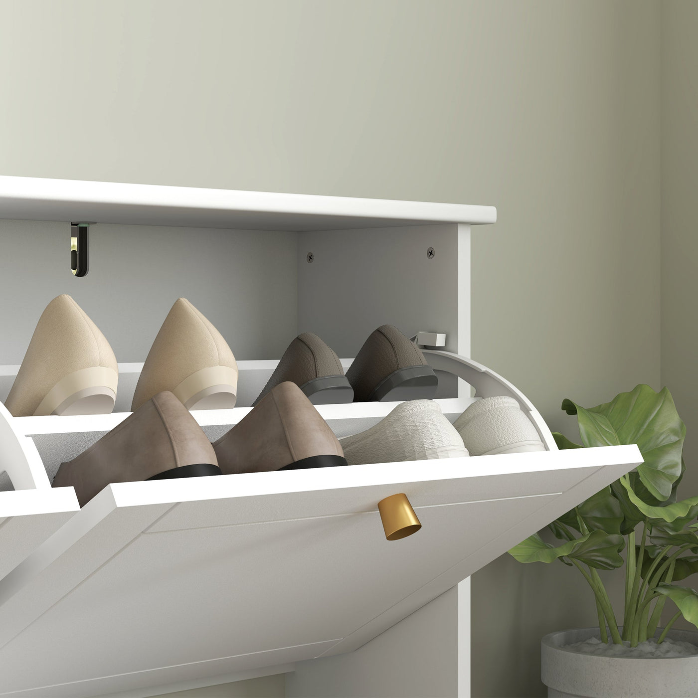 Step into style and organization with the slim shoe storage cabinet from HOMCOM. Its sleek finish, carved lines and chic golden handles add a modern twist to any entryway. This hidden narrow shoe storage features four flip drawers that neatly store up to 16 pairs of shoes, with adjustable shelves for added convenience. Suitable for tight spaces, this hallway cabinet combines elegance with functionality.