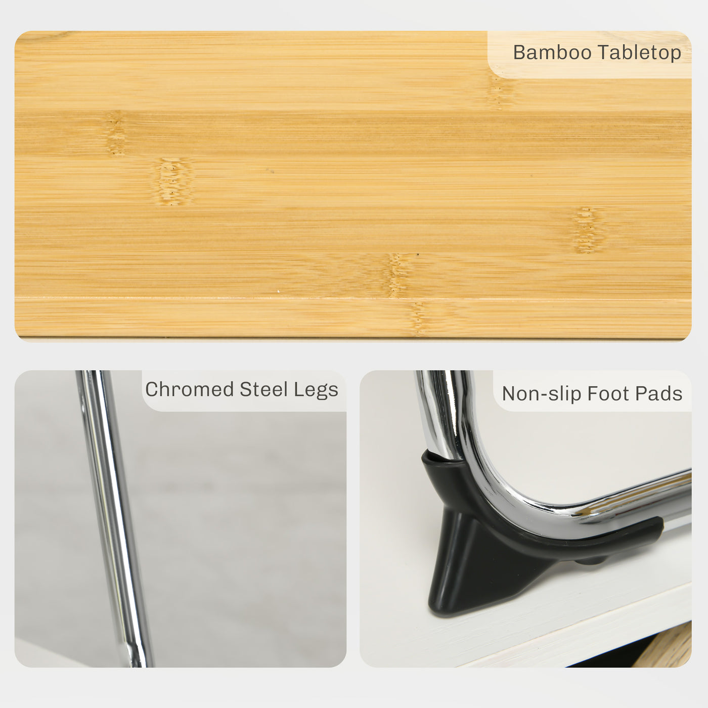 Enjoy a bottle of wine, with your favourite person - anywhere. This HOMCOM foldable table comes with a bottle and two glass holders - holding everything in place. The bamboo tabletop means a beautiful and tough holding surface, with a protective varnish coating. Steel legs for a supportive base. A foldable design to take with you anywhere.