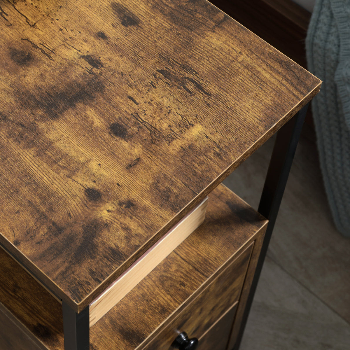 Storage to use wherever you want, in a stylish Industrial design. Use this set of 2 side table in the bedroom, the hallway, the lounge, the office - wherever you want. A beautiful Industrial-style design, the stained wood effect of the body will draw attention to itself with ease. The end table features two bottom drawers and a middle and top shelf - plenty of storage room. The metal frame is strong, so this small table stands proud in place.
