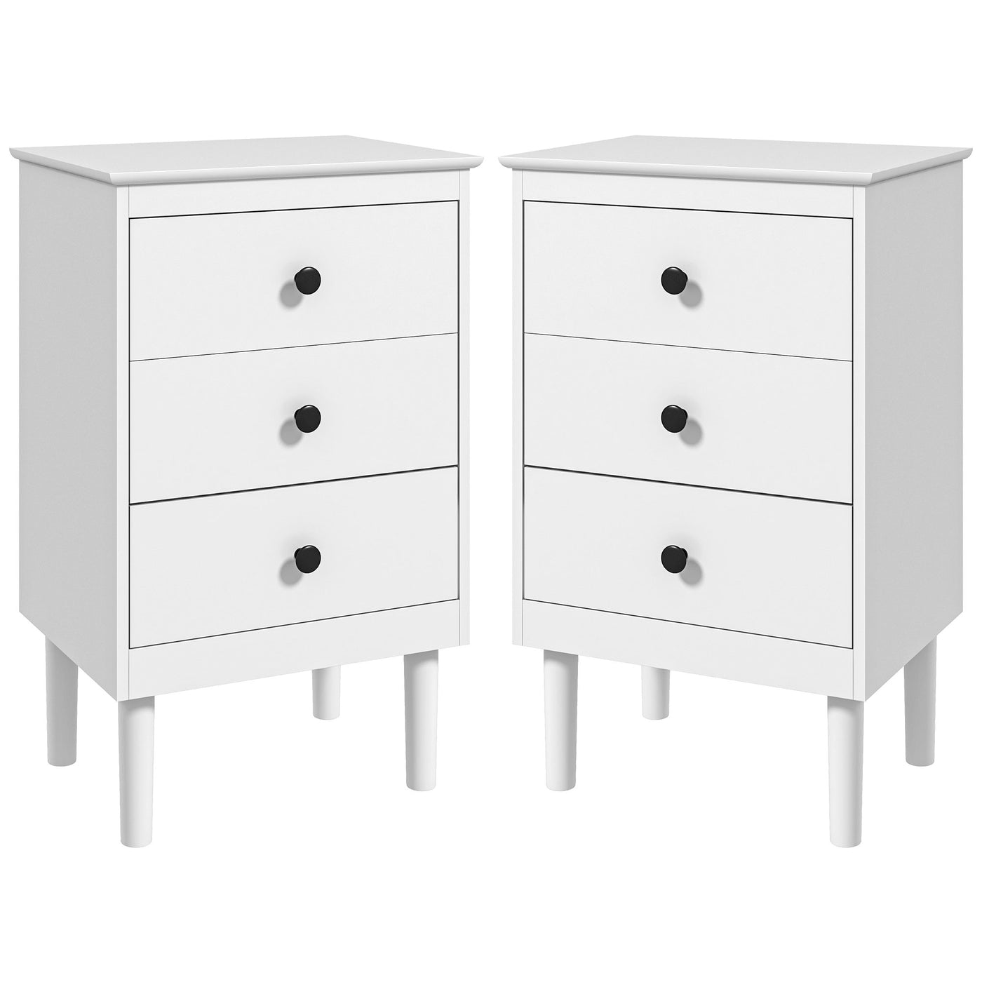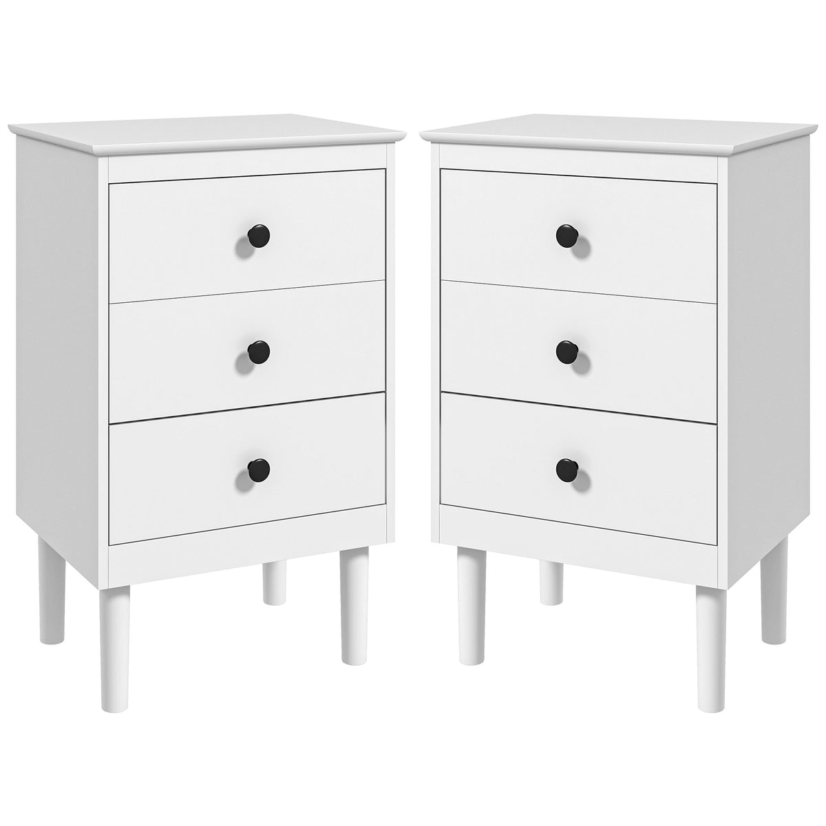 Simple style for all homes, offering plenty of nighttime space: say hello to these two HOMCOM bedside tables. In a clean white boxy design, they are super easy to welcome into your home interior style; the black handles add a touch of striking contrast. Three drawers offer handy holding room, with a flat tabletop to make space for essentials like an alarm clock. Made from particle board, each nightstand is reliable, with anti-tipping straps to securely fix to the wall.