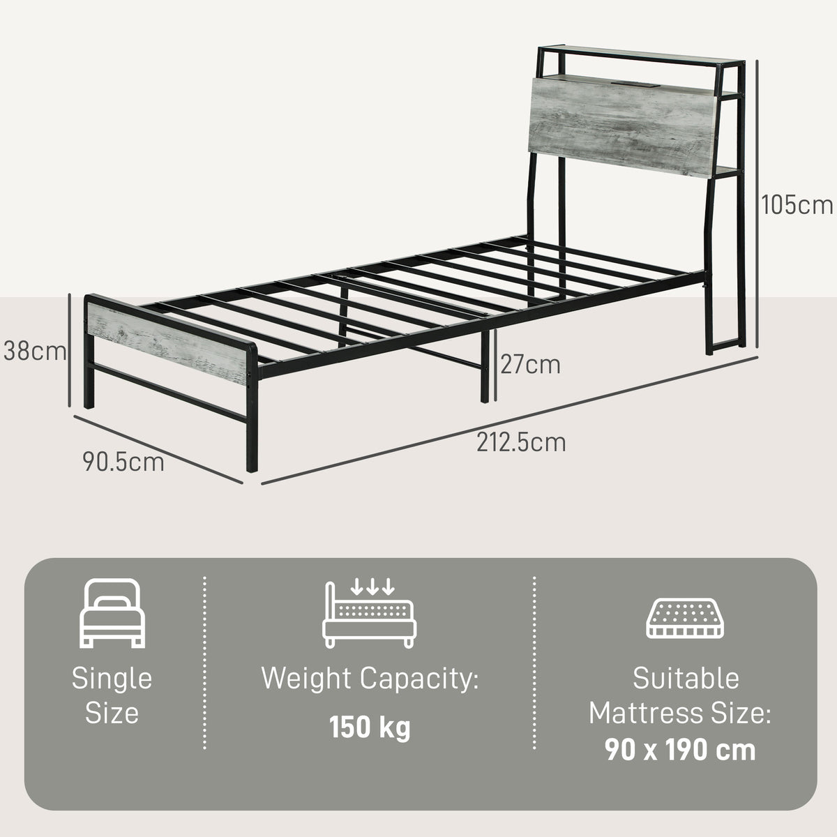 HOMCOM Single Steel Bed Frame, with LED Lights and Headboard Shelf - Grey - Cement Grey
