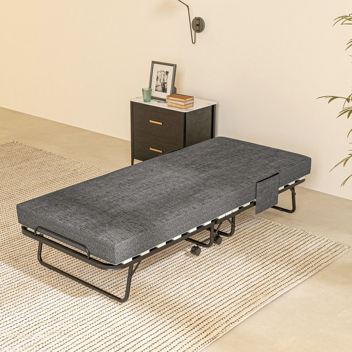 Sleeping convenience, wherever with this HOMCOM foldable bed. It's folding design means you can pull it out and pack it back up quickly. Fitted with a padded mattress with linen-look cover, this fold up bed is a soft and comfortable piece everyone will enjoy using - no bad nights sleep again! A steel frame for a strong core - finished with four lockable wheels to move it around easily.