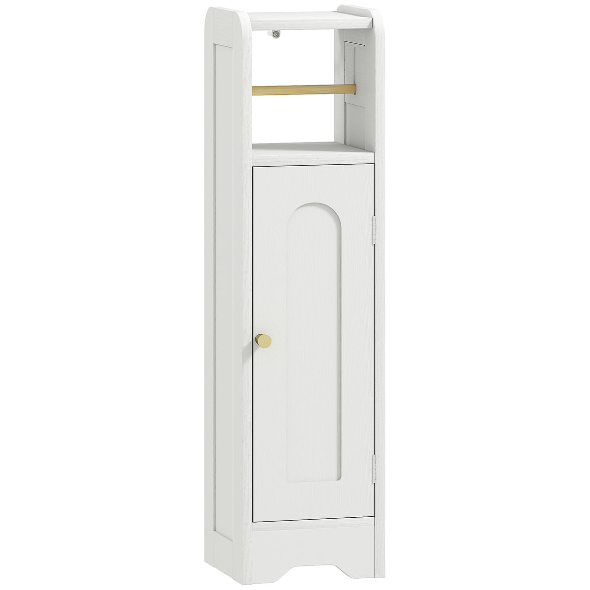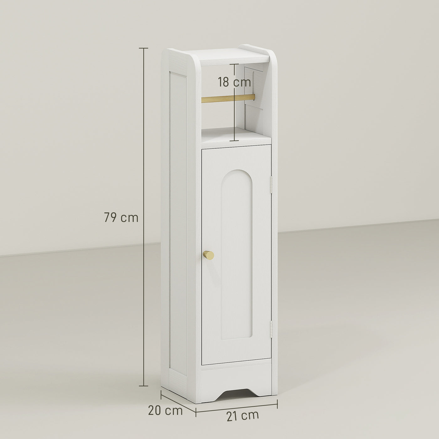 Make the most of tight bathroom spaces with this slim toilet roll holder from HOMCOM. The embossed wood-effect finish and arched door panel add soft sophistication, while the gold-tone knob and gently curved base bring a modern flair to your bathroom. A 2-tier cabinet with adjustable shelf offers handy storage and the top is great for small items. The easy-roll holder swaps paper easily and fits tissue boxes too. Reliable, safe and easy to clean – a great upgrade for everyday living.