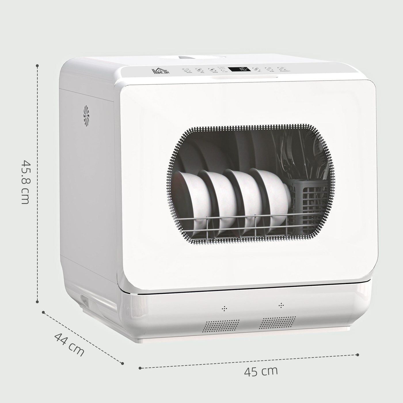 Say goodbye to the hassle of manual dishwashing, anywhere, with this HOMCOM tabletop dishwasher! It features six programs: intensive, efficient, normal, rapid, fruit wash and drying. The efficient spray arm ensures sparkling clean dishes every time. A compact dishwasher, suitable for four-person households.