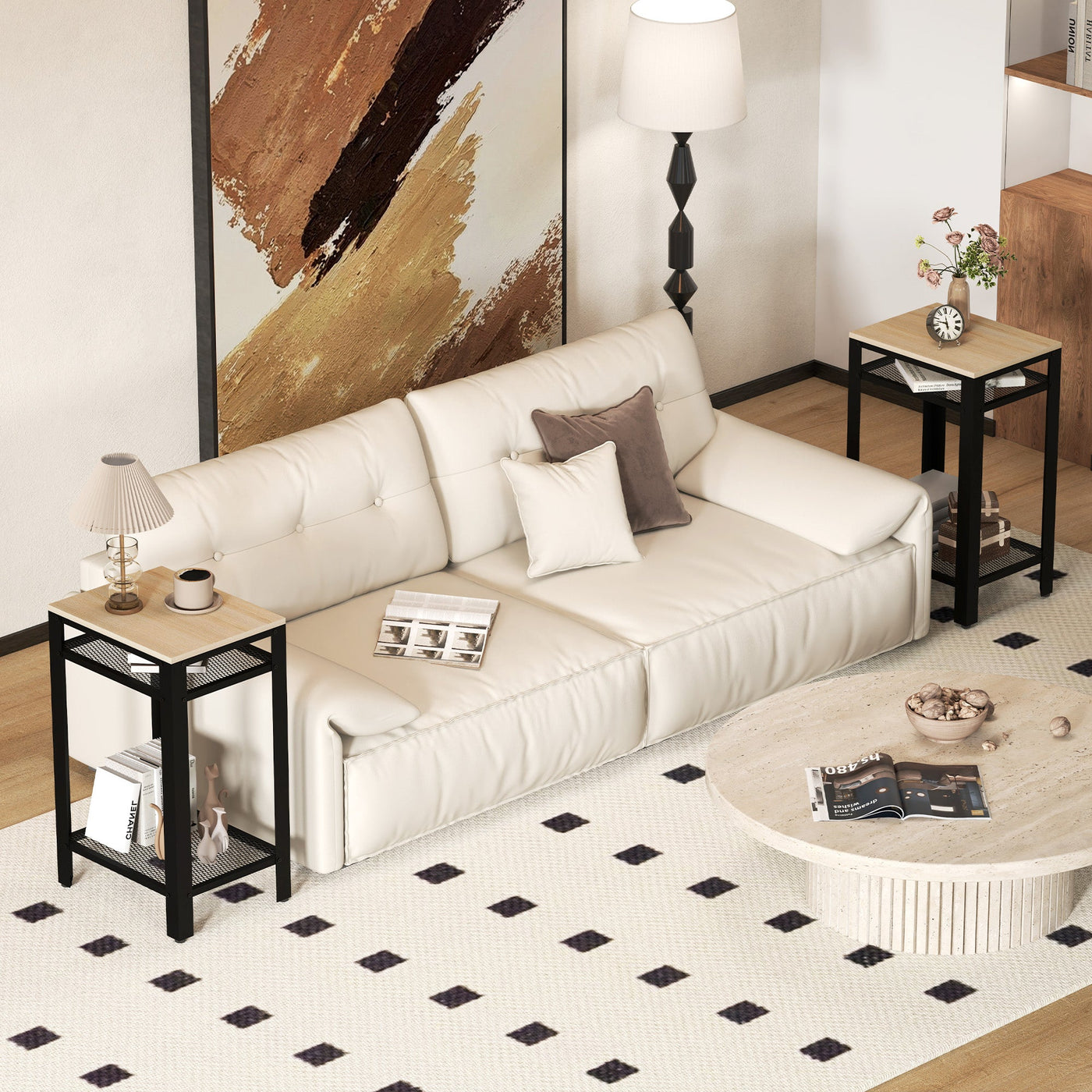 HOMCOM Tall Side Table Set of 2 with 3 Layer, 2 Shelves Storage Display Industrial-Style, Metal Frame, Bedside End Table for Living Room Bedroom, Oak and Black - Oak