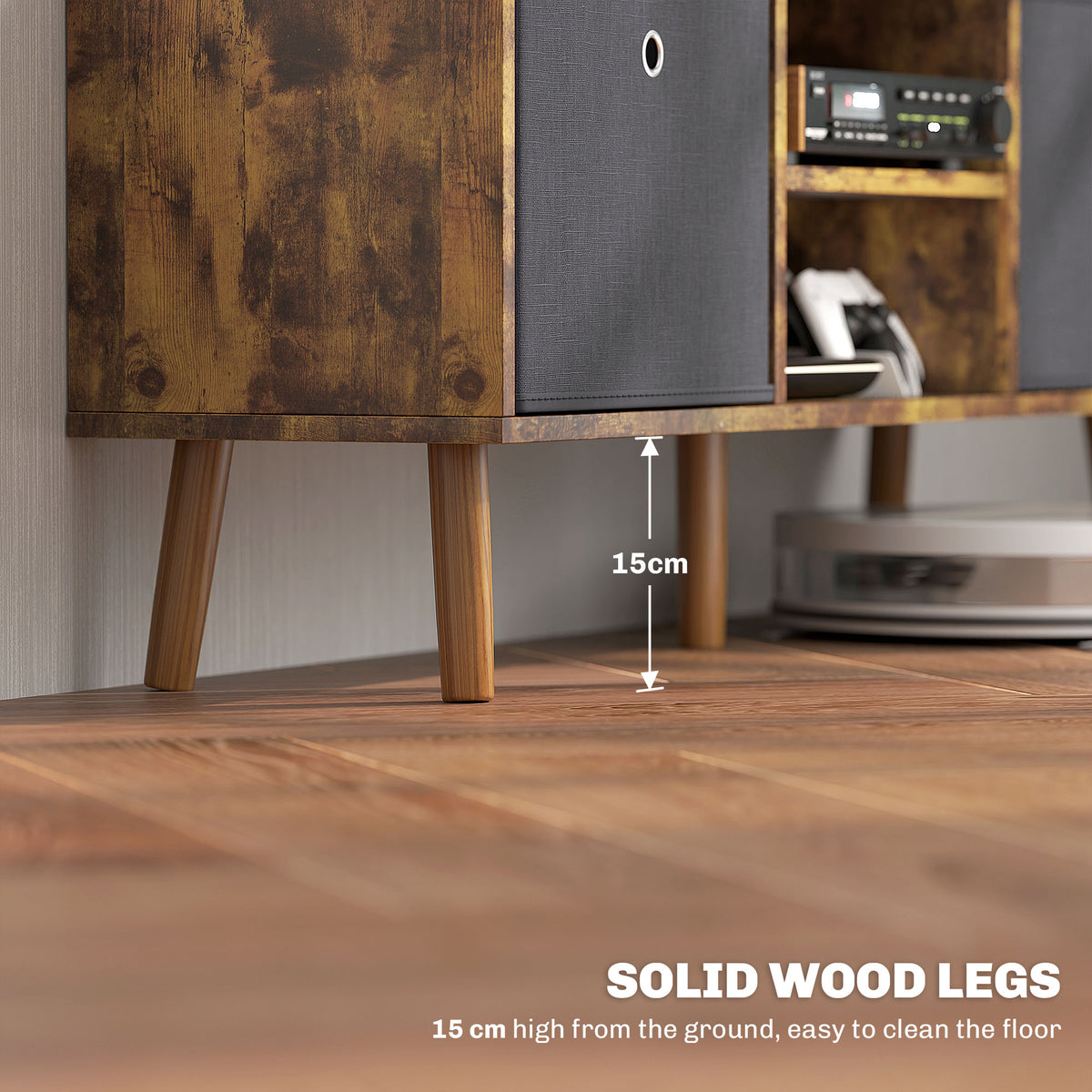A new take on a TV unit or simple home storage - the choice is yours with HOMCOM unit. There are two shelves and two drawers - offering large amounts of space to keep the home tidy. Table top is large enough for a 50" TV or screen. Five wooden legs keeps it balanced and supported. And to double your storage? You can easily take out the fabric drawers.