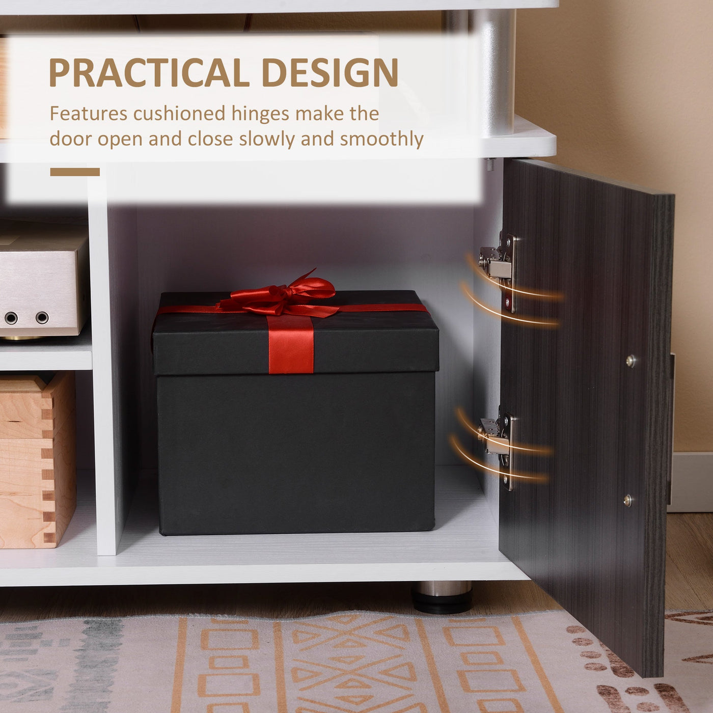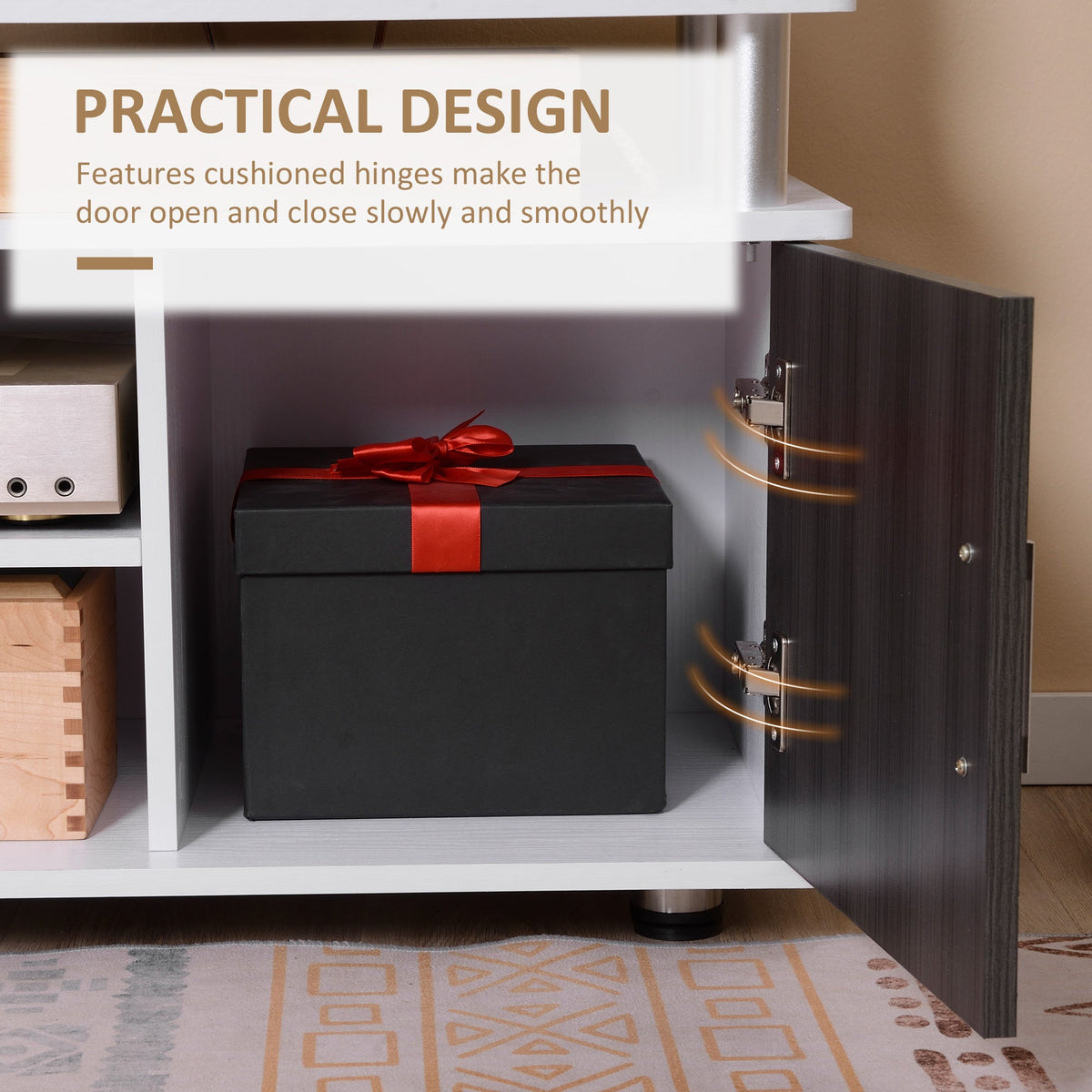 HOMCOM TV unit blends perfectly into your modern, simple lifestyle. It features the large top panel which holds up to 120Â cm flat panel TV screen. There are also open display shelves to hold your entertainment equipment and two compartments with doors for your loose stuff such as CDs, DVDs, and games. Designed to be lightweight and space-saving. The cable management system helps you maintain a tidy entertainment space.
