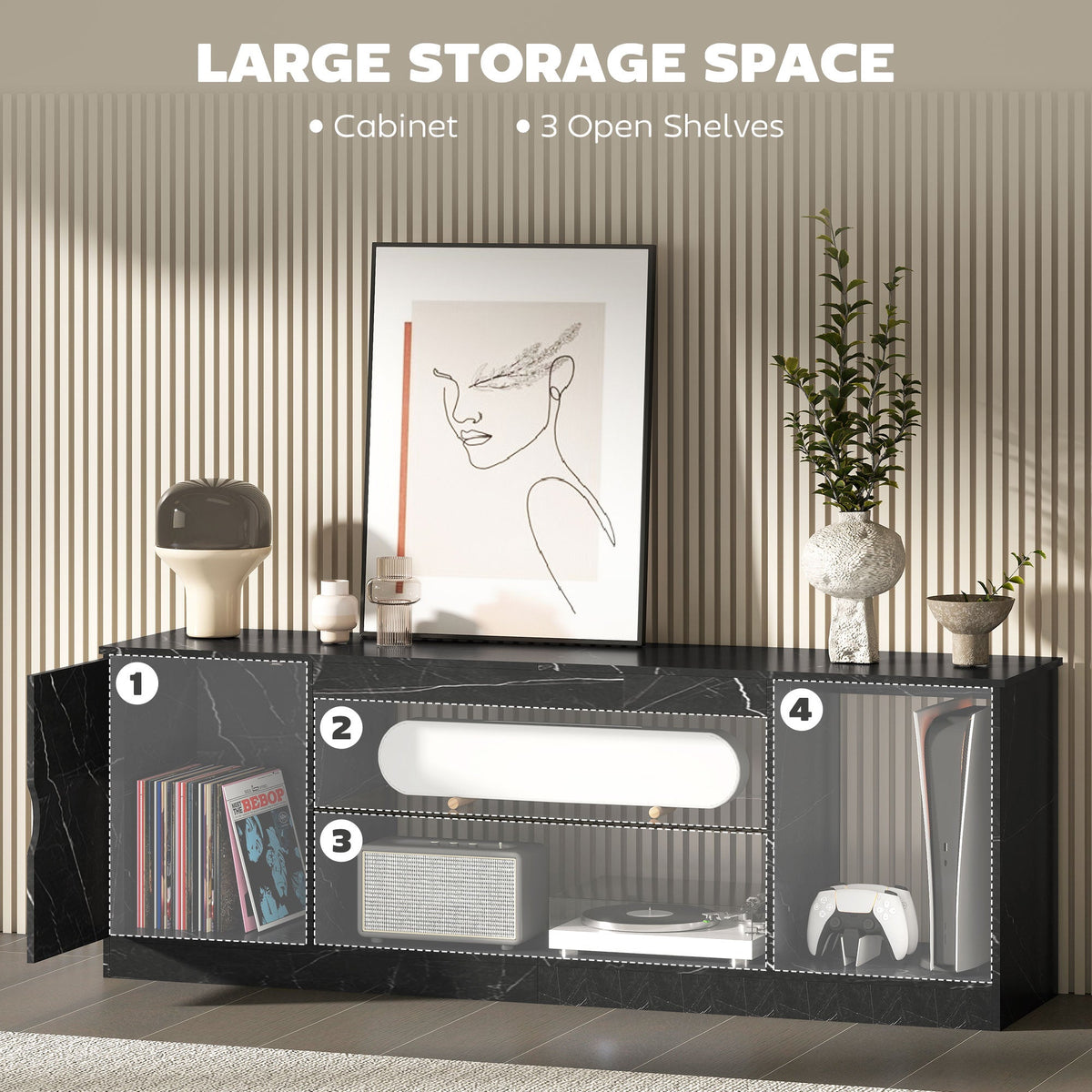 Elevate your living space with the HOMCOM TV stand, showcasing a chic black marble pattern designed for 45" and 55" TVs. This tv cabinet blends style with functionality, offering three open compartments and a hidden cabinet for all your gadgets. Crafted from particle board with a melamine coat, it promises lasting stability and is a breeze to maintain.