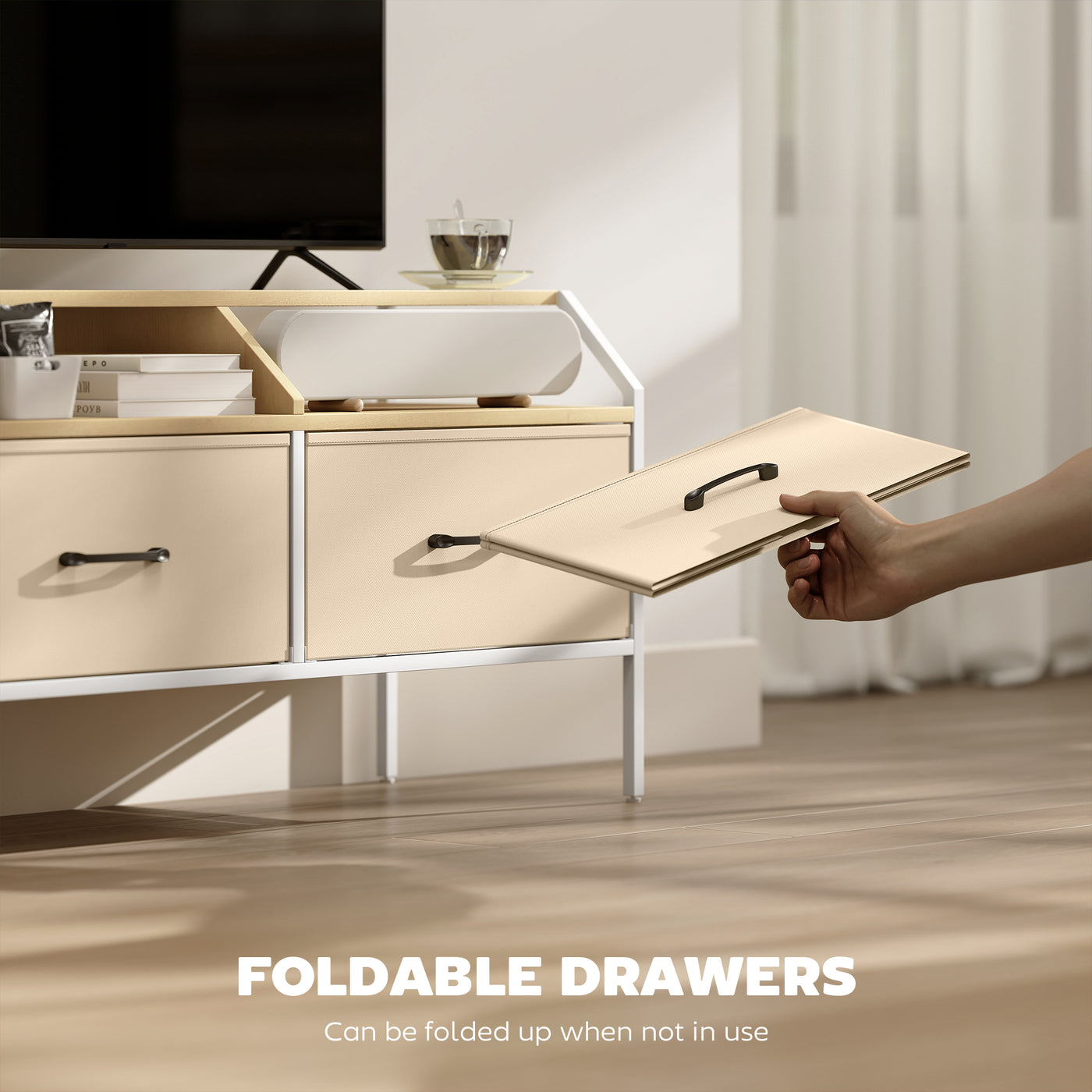 HOMCOM TV Stand Cabinet, TV Unit for 55-inch TVs with 2 Foldable Fabric Drawers, 5 Divided Side Pockets, Open Shelves, Console Table for Living Room, Bedroom, Entertainment Room, Natural Wood Finish - Natural wood finish