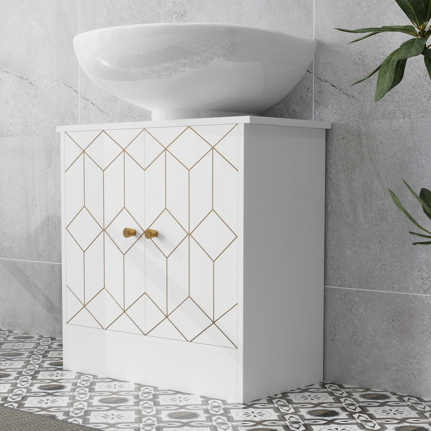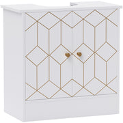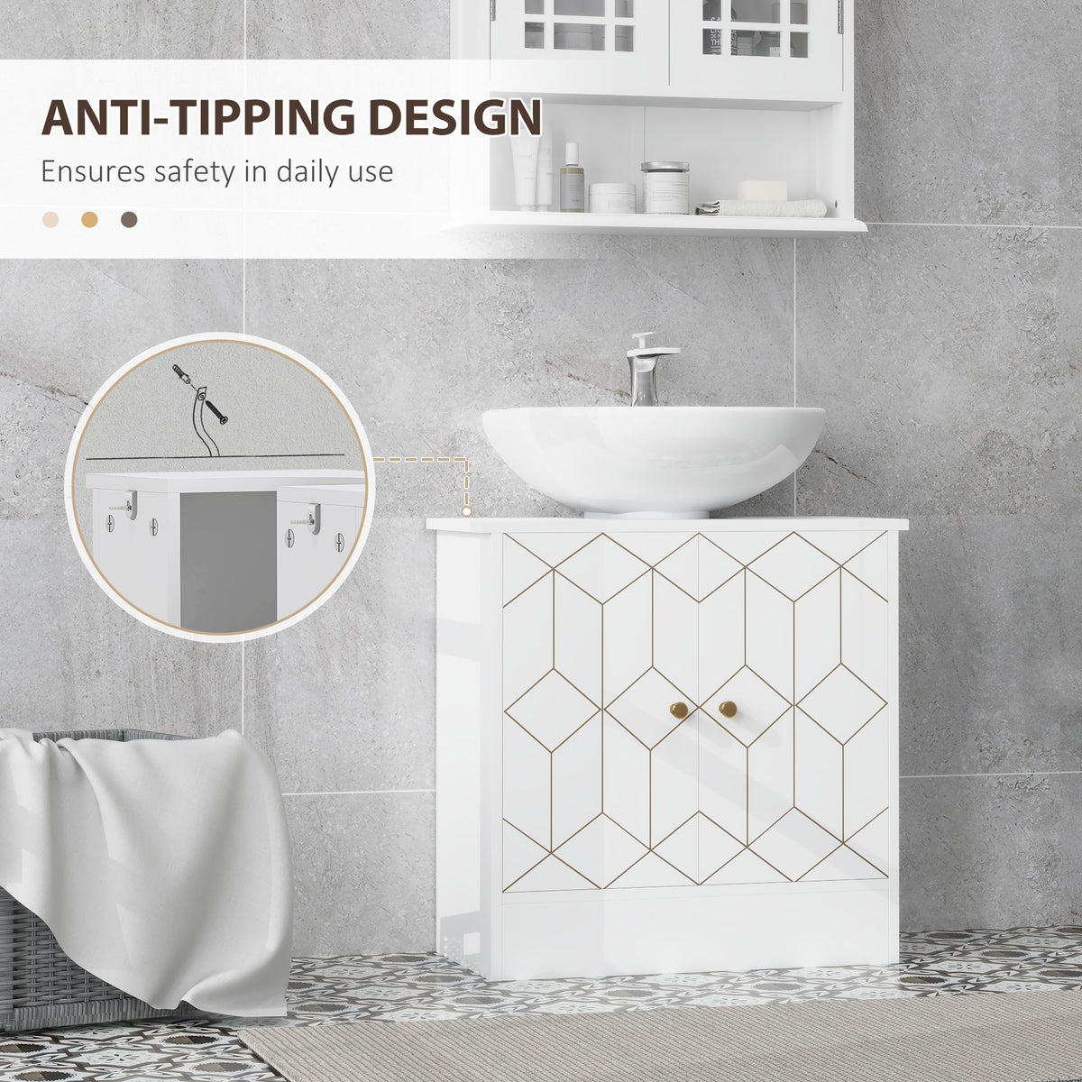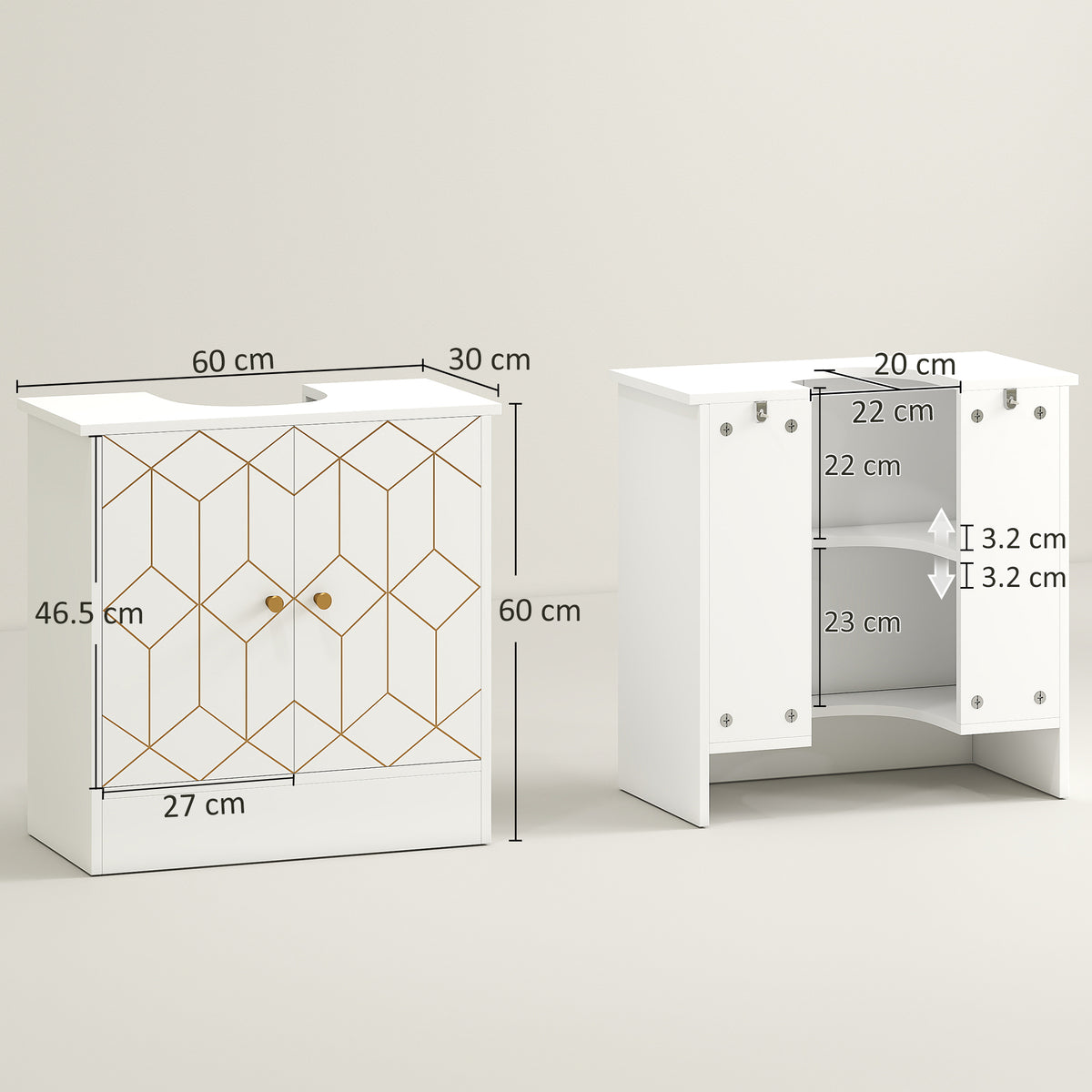Maximise your bathroom's potential with the HOMCOM under basin cabinet. Its clever design features pre-cut U-shaped slots to fit around most basins, instantly tidying up your space. Enjoy easy access with two open compartments and a three-tier adjustable shelf, all styled in a chic white with gold tone accents for a splash of elegance. A smart solution for any stylish bathroom!