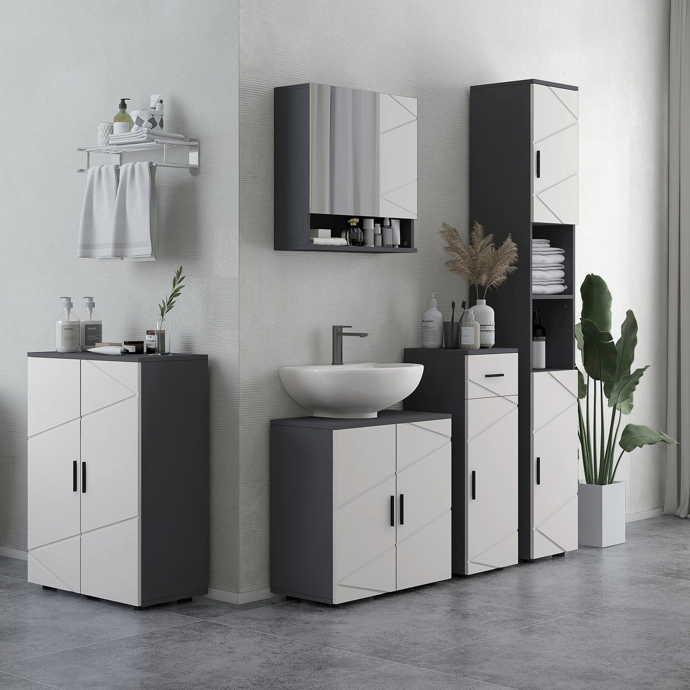 Transform your bathroom with the kleankin 5-piece bathroom furniture set. This chic ensemble includes a tall storage cabinet, two cosy floor cabinets, a pedestal sink cabinet and a sleek mirror cabinet, all designed for maximum storage with multiple shelves. The adjustable inner shelves cater to your storage needs, while the smooth, easy-to-clean surface and anti-tipping design add a touch of safety and style to your space.