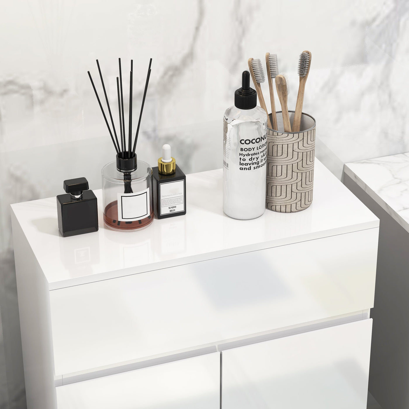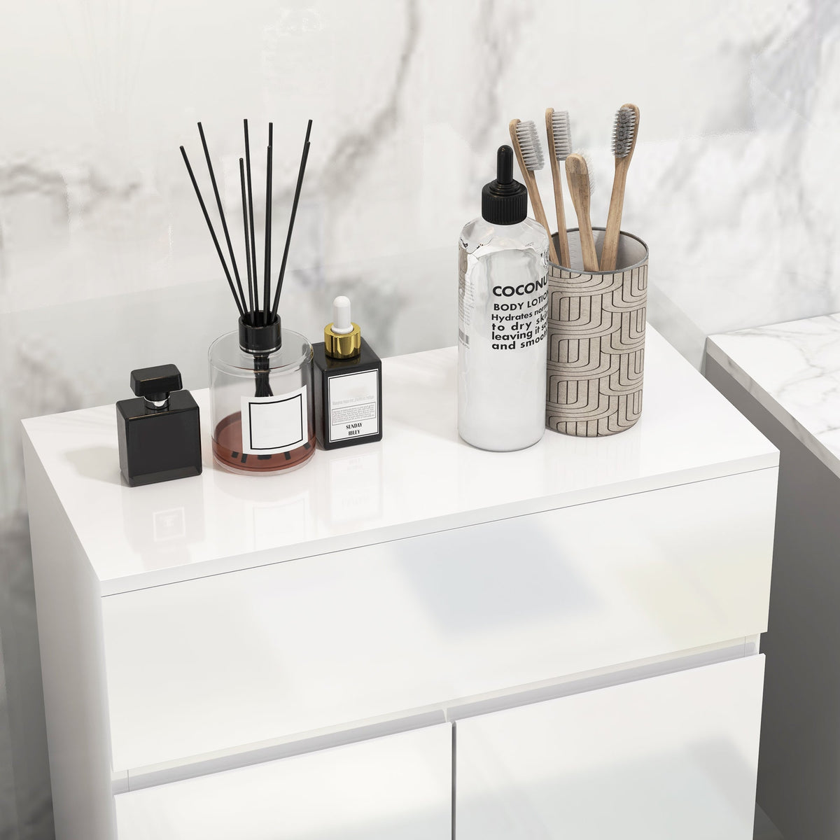 This HOMCOM storage cabinet is a stylish, space-saving design. Its high gloss and multi-storage design makes it perfect for smaller modern spaces. Combining a top drawer and bottom cupboard, it offers room for cleaning products, hygiene items and even towels. Look to the adjustable shelf to fit in differently-sized items. Comes with anti-tipping straps to attach to a wall for safety: this bathroom unit won't topple forwards.