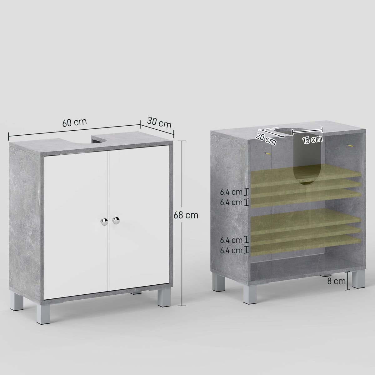 Beautiful storage in a handy shape. This under-sink cabinet from kleankin will easily keep your bathroom clean and tidy. It comes with two adjustable shelves inside to offer more storage than expected - adjustable to set to a level you want. Made from particle board, this piece is tough, presented in a white and grey marble-effect design - modern and beautiful. Complete with polished door handles for a sleek finishing touch.
