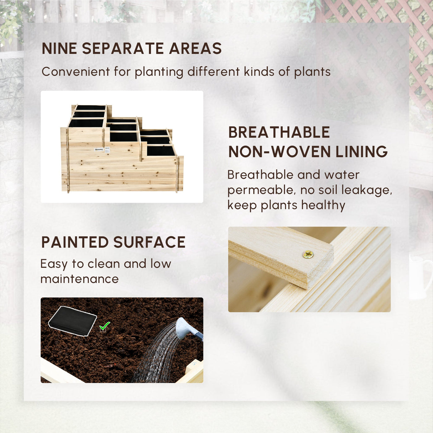 Embrace sustainable living with the Outsunny raised garden table, crafted for eco-conscious enthusiasts. Made from 100% natural fir, this garden solution aligns with your commitment to the environment. Its innovative design features three tiers and nine compartments, offering ample space for diverse plant growth, accommodating various root lengths and sizes. Ideal for busy lifestyles, it requires minimal maintenance, allowing you to enjoy urban gardening effortlessly.