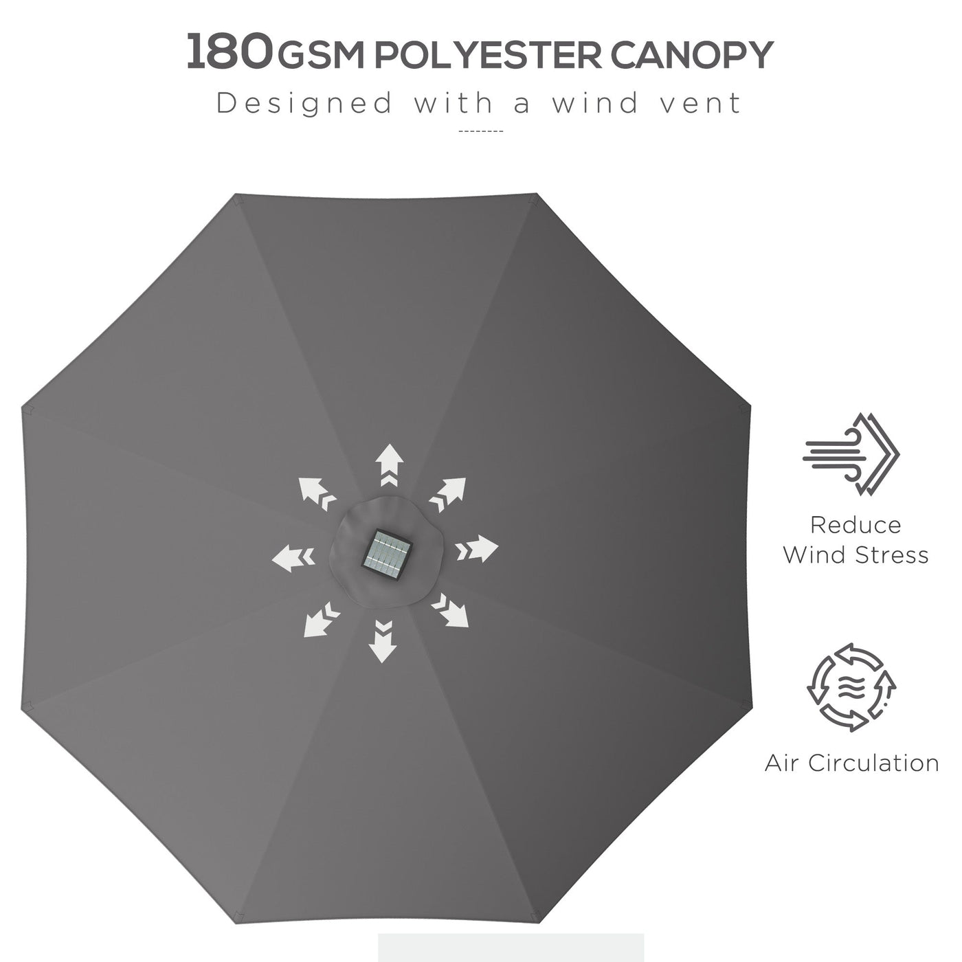 This Outsunny garden table parasol is a solar parasol that offers more than shade. The built-in warm yellow LED lights illuminate your space when dark. Open and close the canopy easily with crank handle. The vented canopy offers plenty of shaded area in the day.