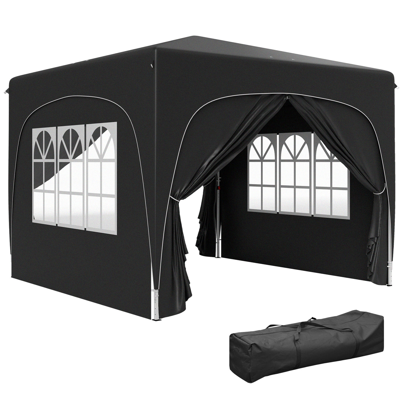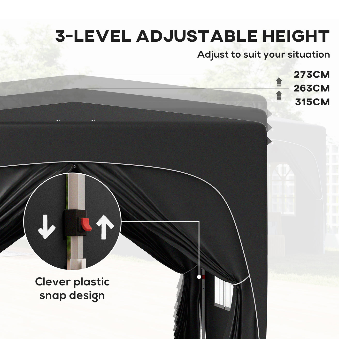 Easy outdoor gatherings with this Outsunny pop-up gazebo. Fitted with a UPF50+ fabric canopy, you and guests are shielded against 98% of UV rays, with a door to enter/leave easily, plus windows to bring light in. Set the metal frame between 253cm, 263cm and 273cm - pick the height you require. Comes with guy ropes and ground stakes for weight - with a bag to keep it in when not being used.