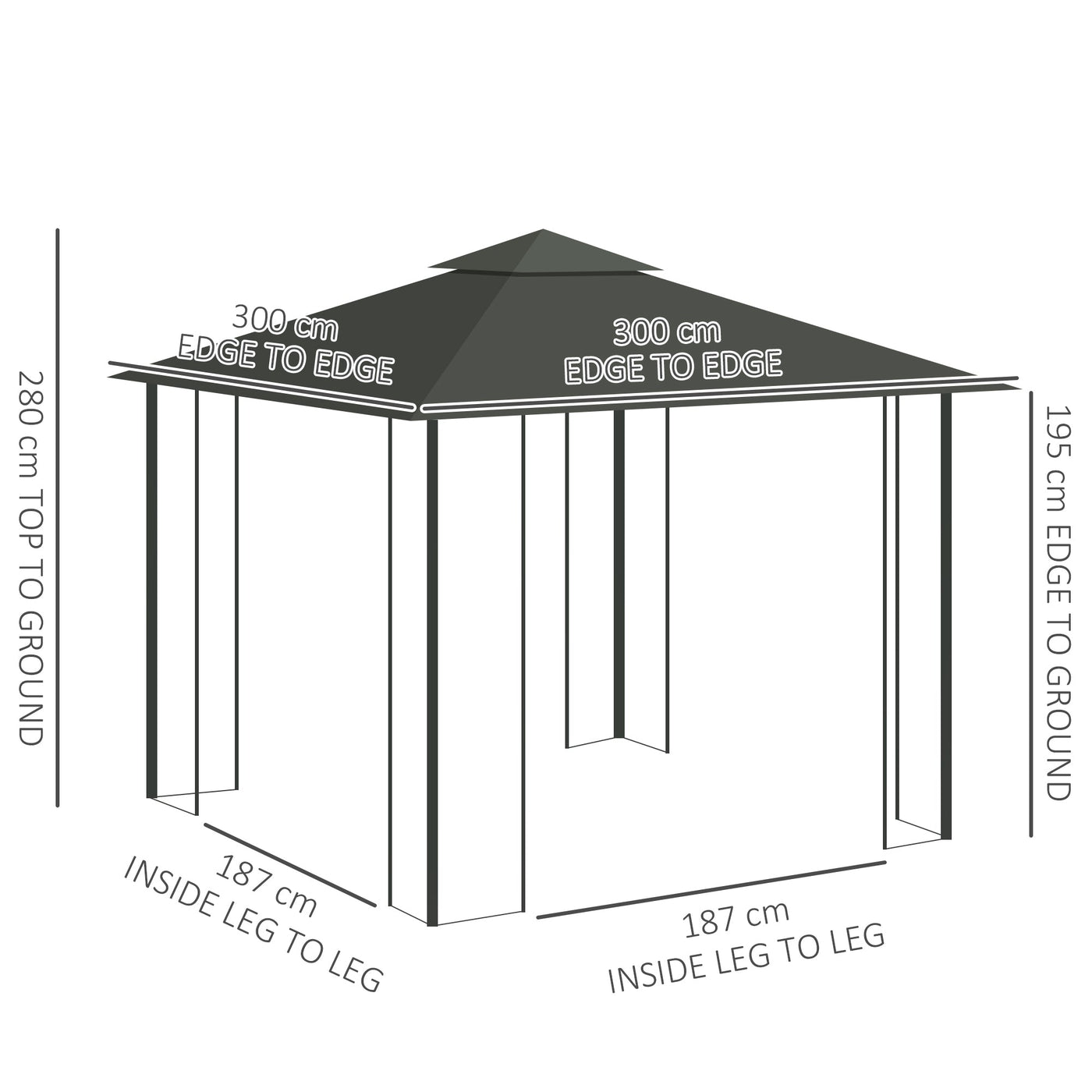 This Outsunny 3 x 3(m) gazebo is great for plenty of outdoor activities. The powder coated steel frame means a strong core, with mesh curtains to create a private or open feel; it's up to you. Netting helps keep insects away. 8x ground stakes included to pin to ground.