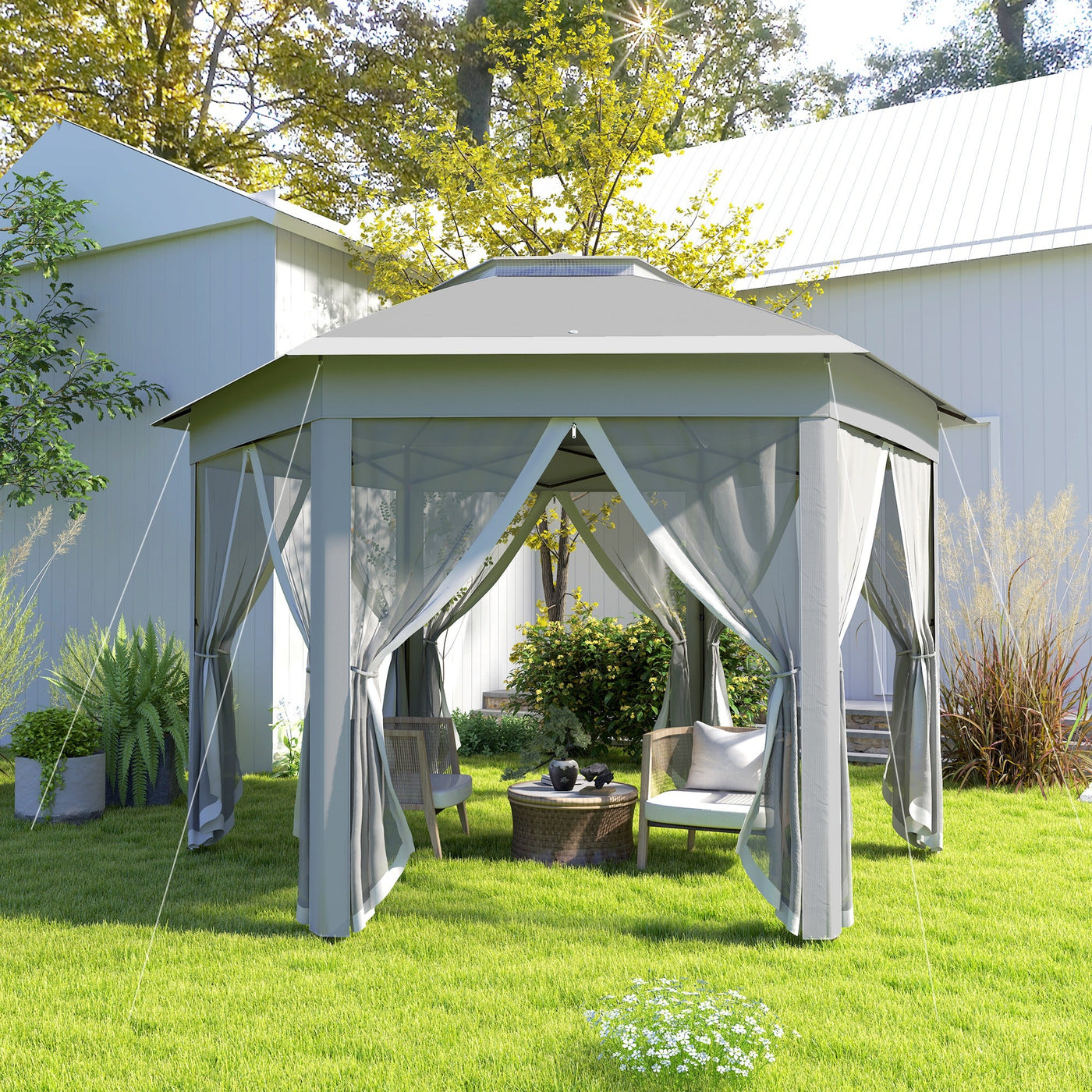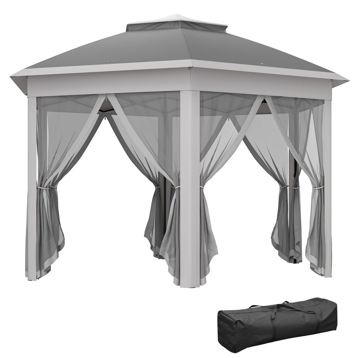 Outsunny 3 x 4m Garden Gazebo Hexagon Pop Up Gazebo Party Tent Canopy Double Roof Instant Shelter with Netting and Carry Bag for Outdoor Patio, Dark Grey - Dark Grey